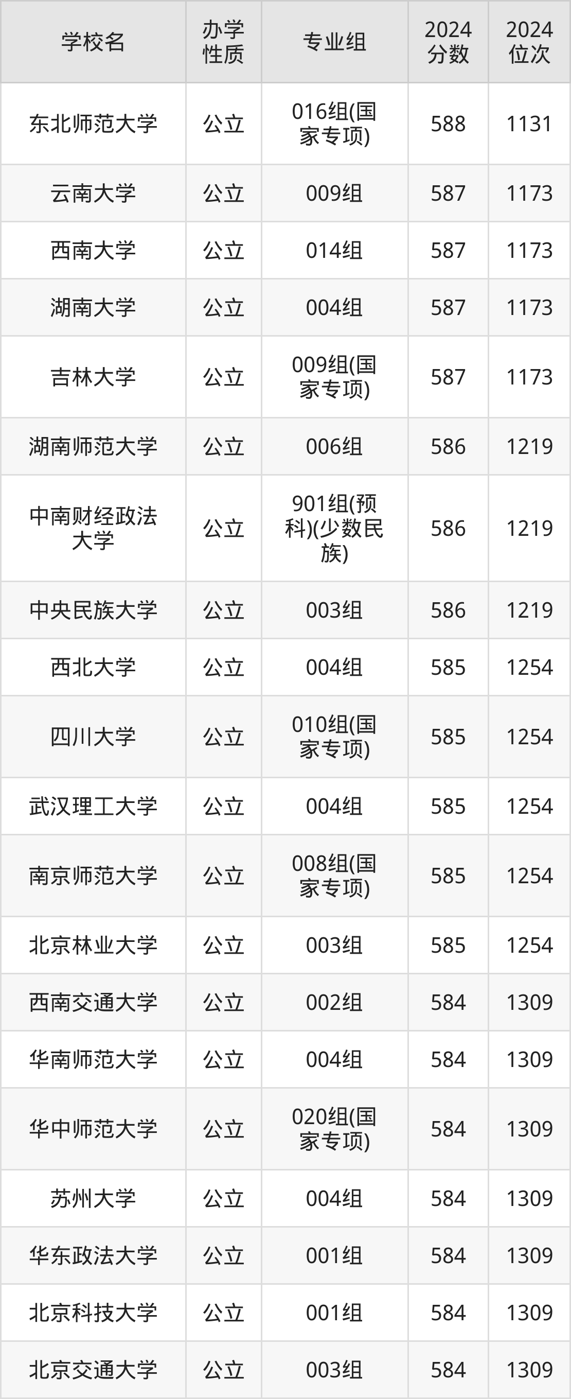 | 中央民族大学 | 901组(预 科)(少数民 族) | 584 | 1309 |