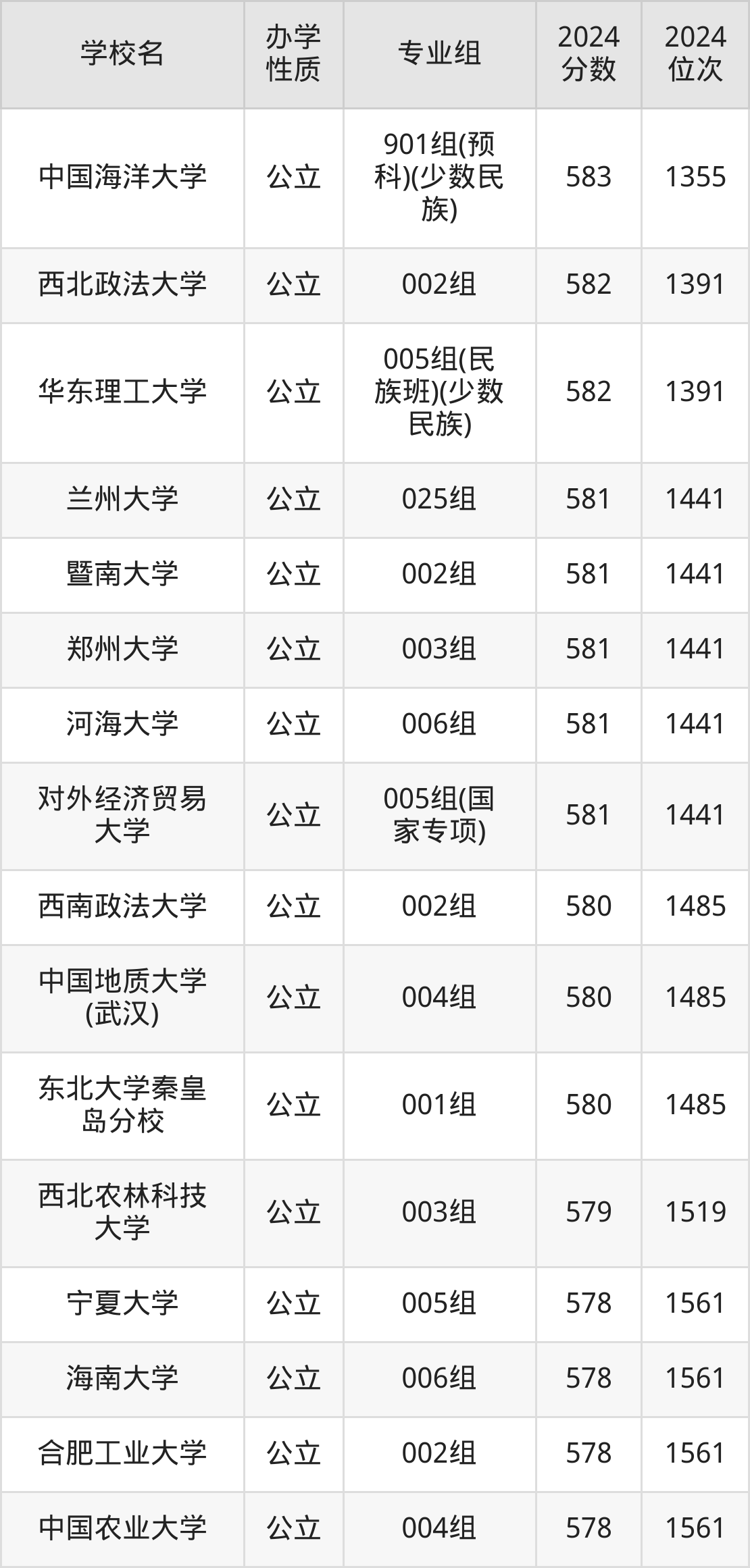| 中国海洋大学 | 901组(预 科)(少数民 族) | 583 | 1355 |