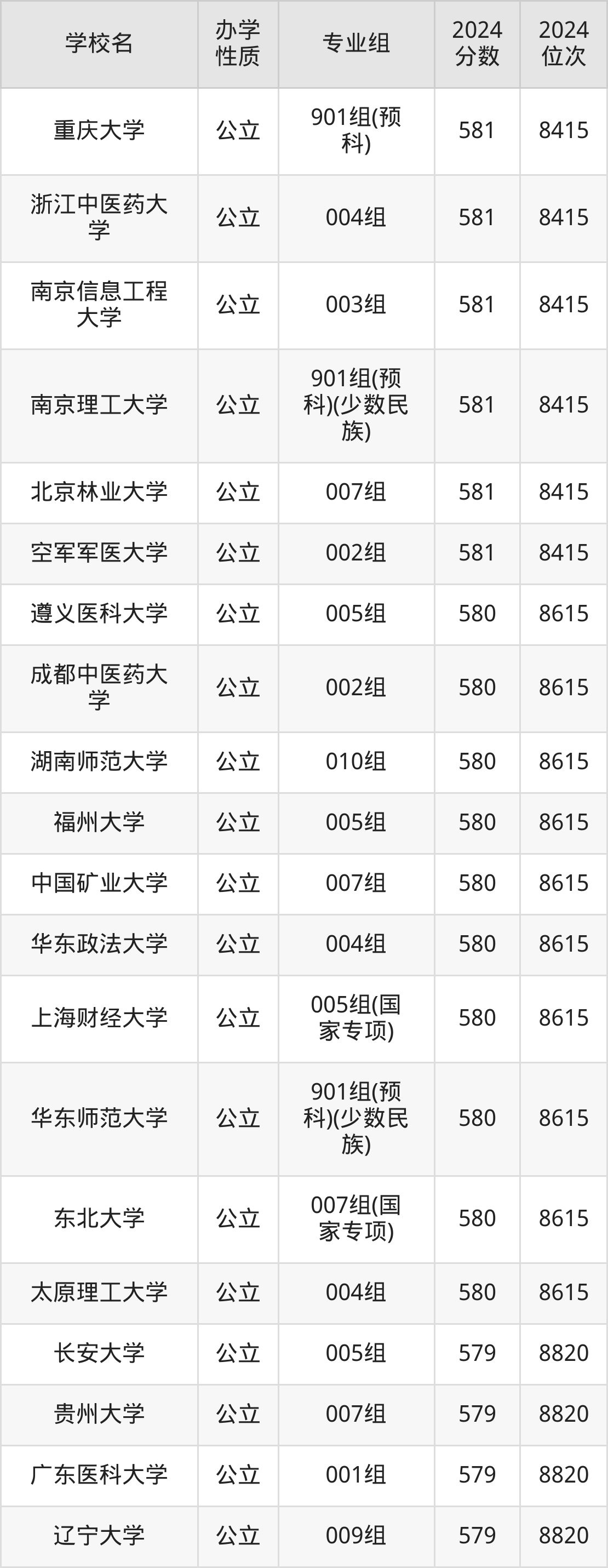 | 重庆大学 | 901组(预 科) | 581 | 8415 |