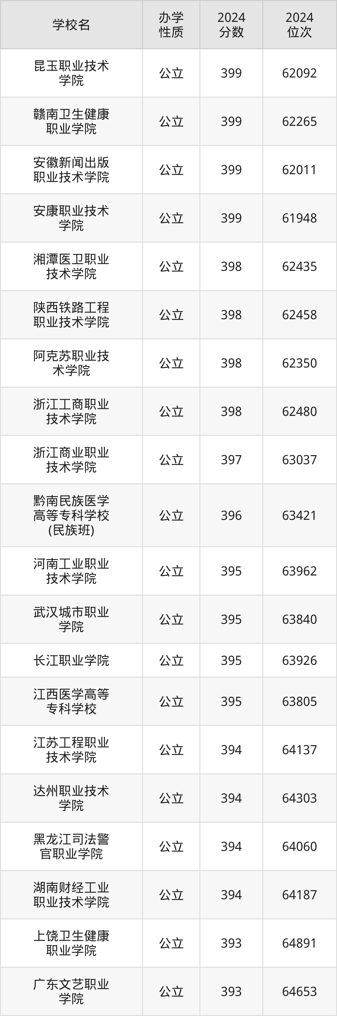 | 达州职业技术 学院 | 394 | 64303 |