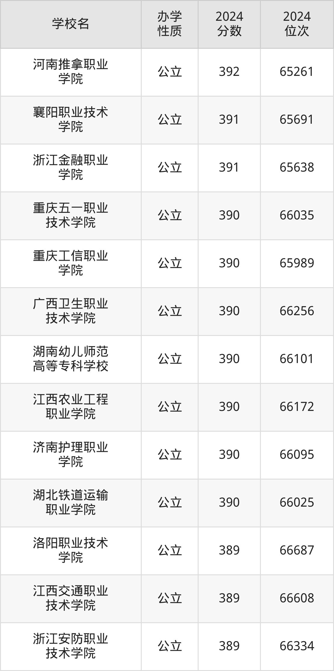 | 湖北铁道运输 职业学院 | 390 | 66025 |