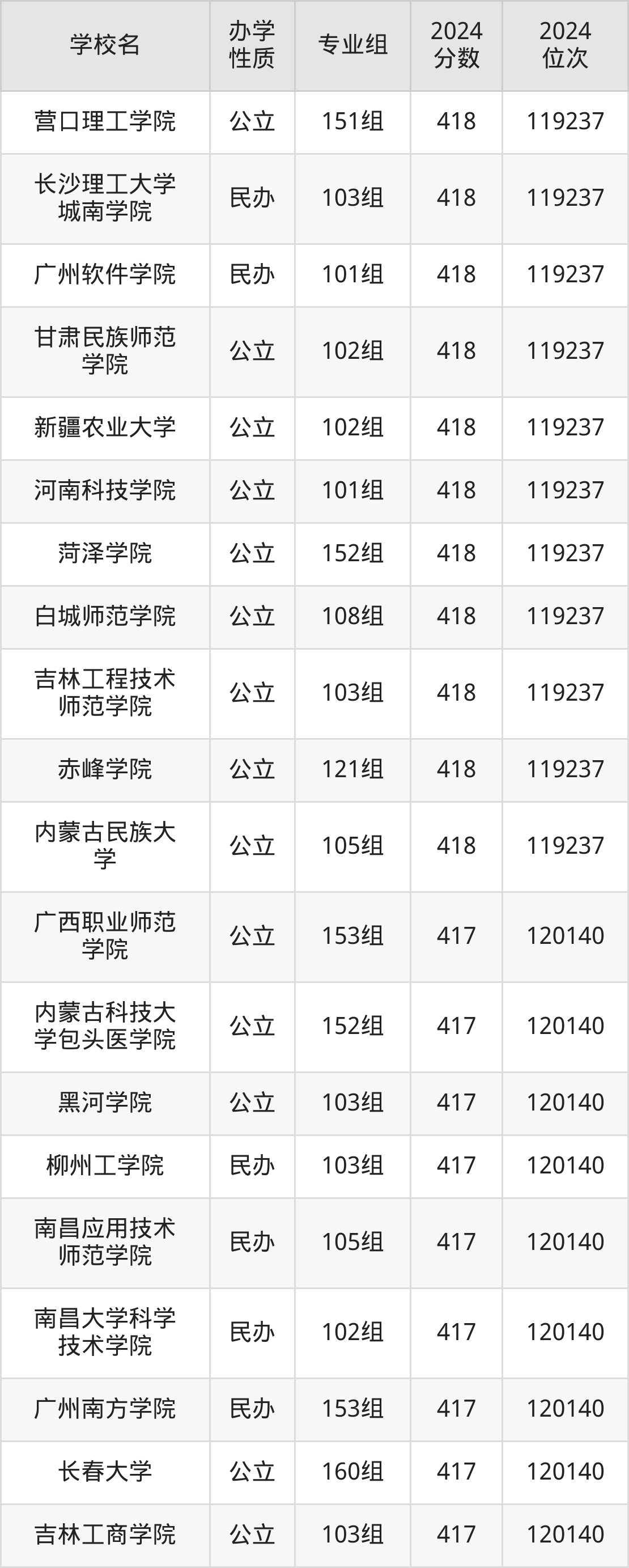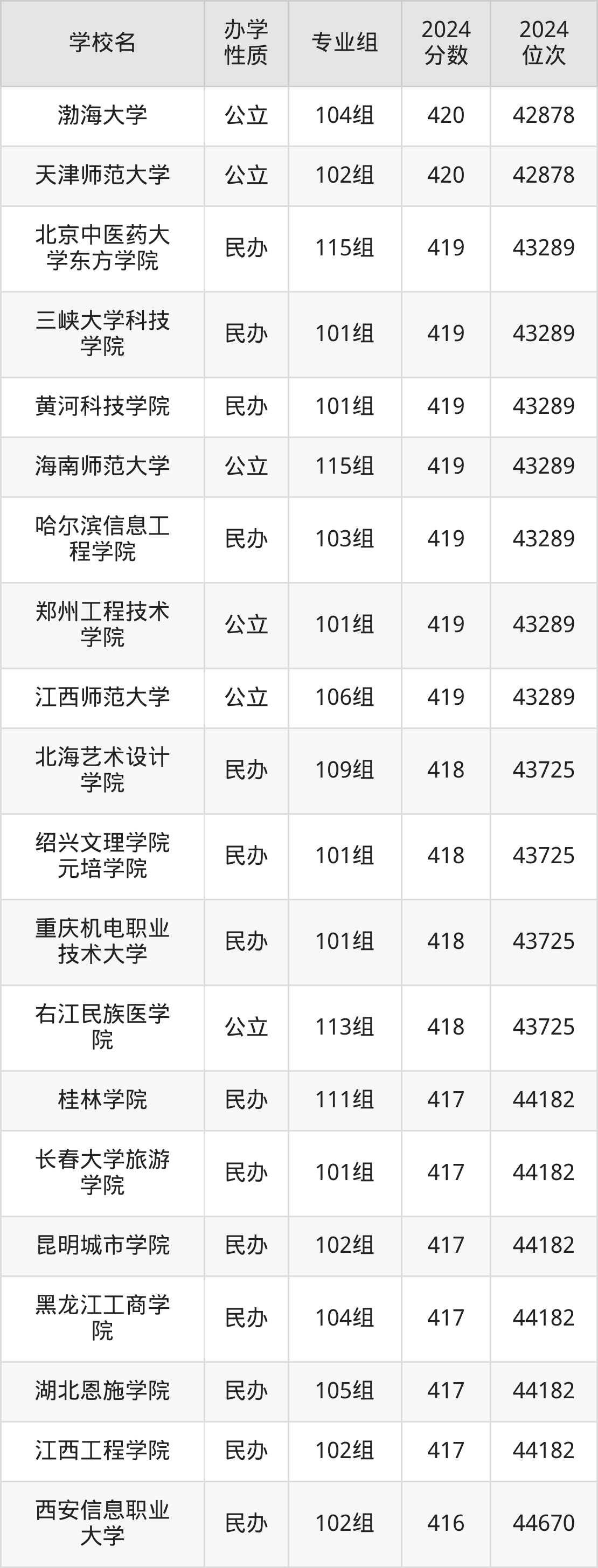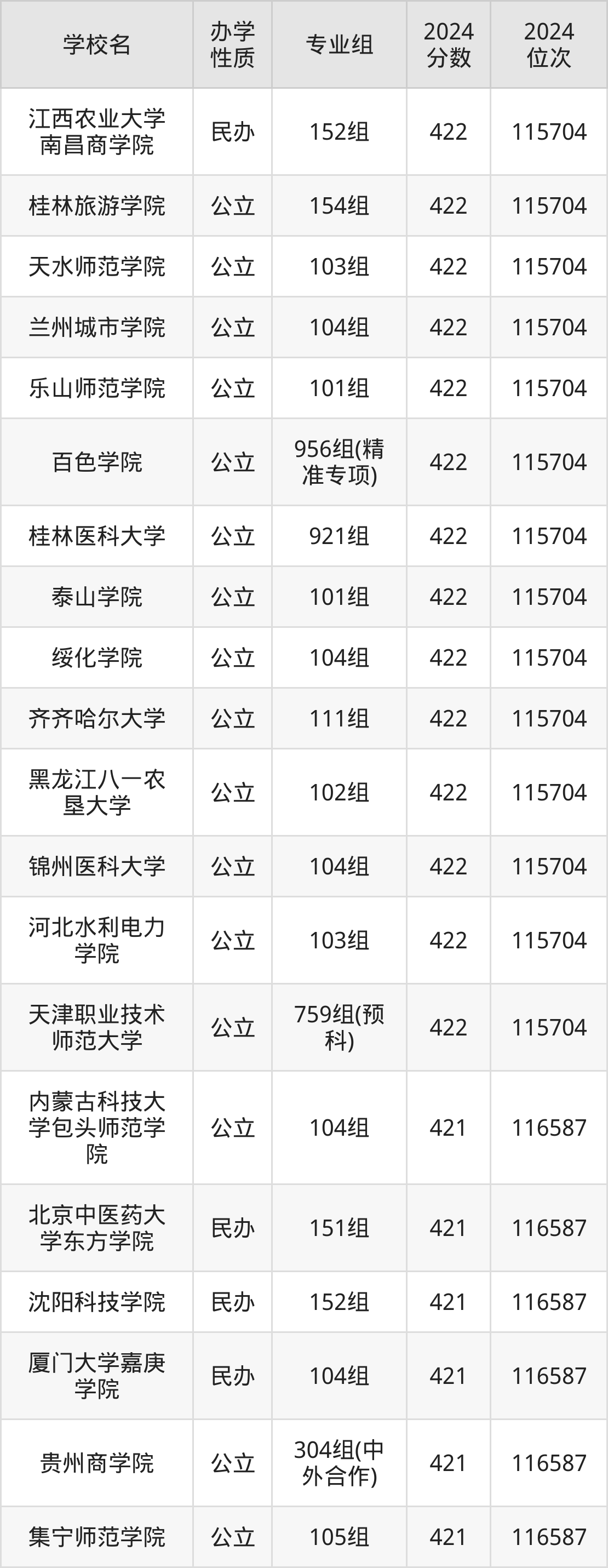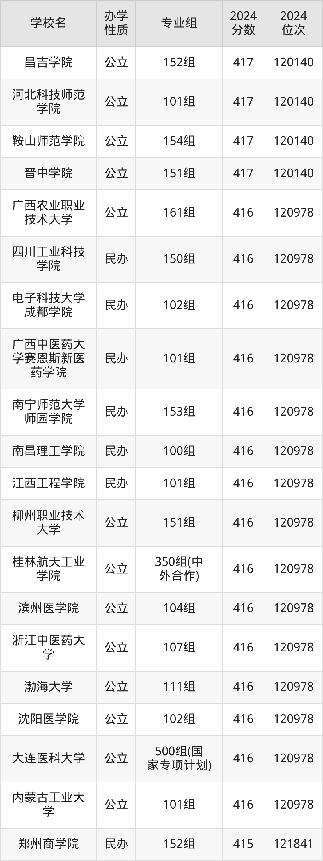 2024年广西物理类417分考生能上江西农业大学南昌商学院、桂林旅游学院、天水师范学院、兰州城市学院、乐山师范学院等138所二本院校,具体录取分数线及位次为: