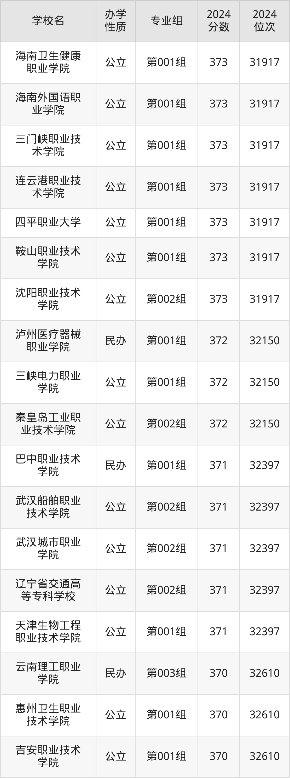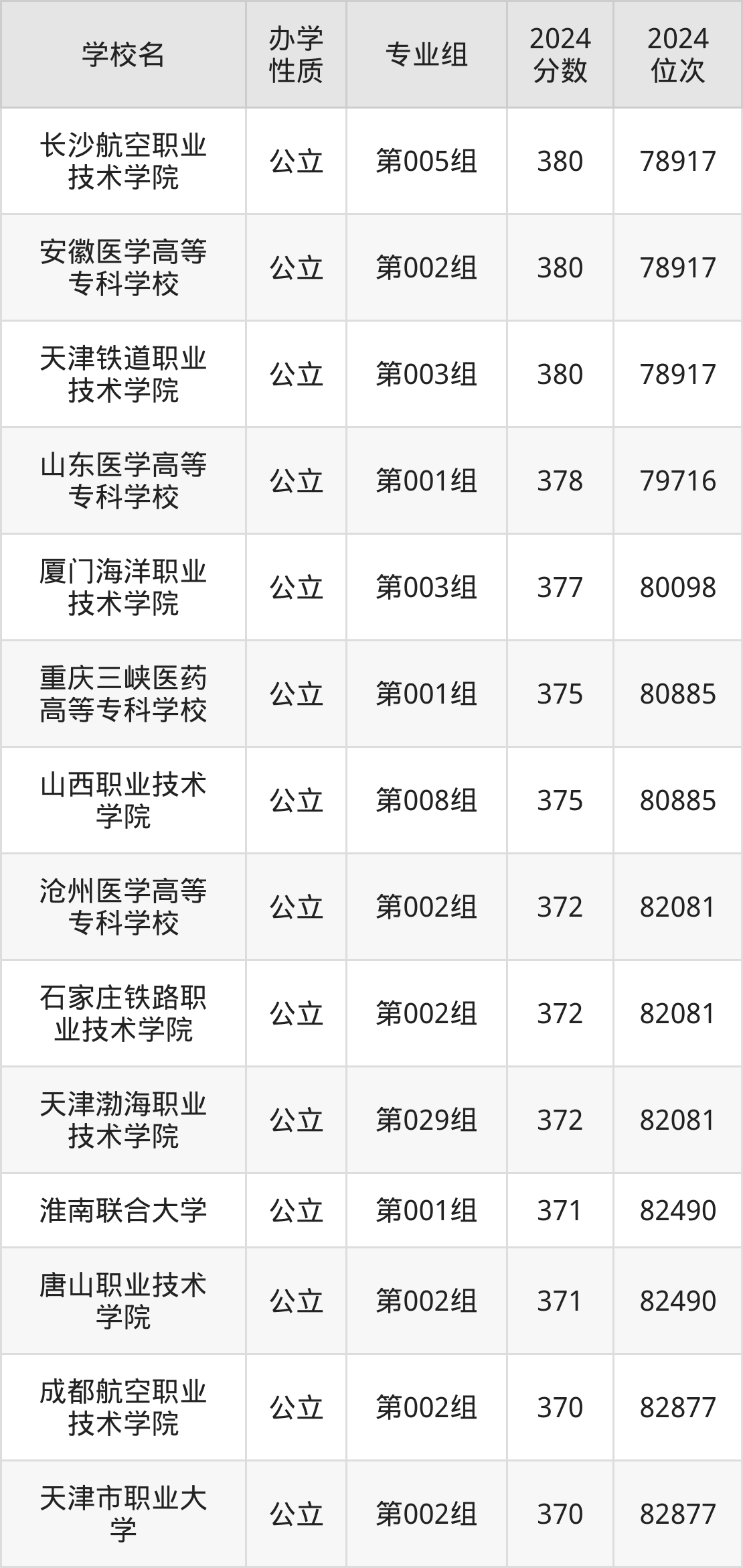 2024年黑龙江物理类375分考生能上长沙航空职业技术学院、安徽医学高等专科学校、天津铁道职业技术学院、山东医学高等专科学校、厦门海洋职业技术学院等14所专科院校,具体录取分数线及位次为: