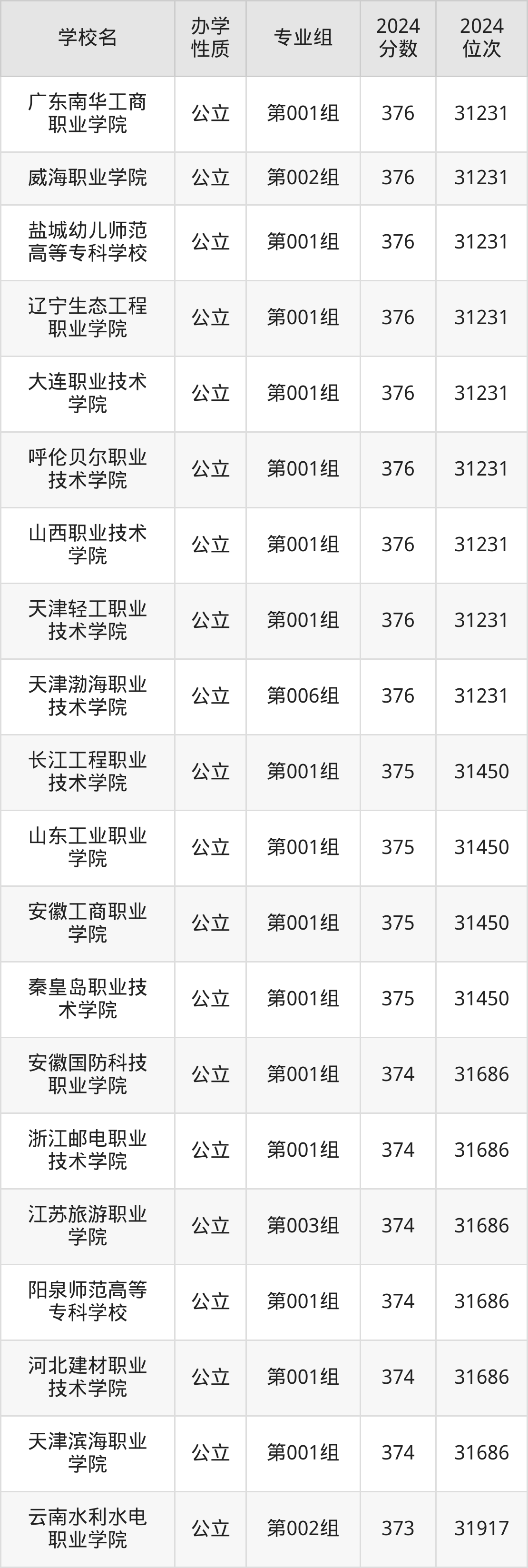 | 辽宁民族师范 高等专科学校 | 第001组 | 380 | 30324 |