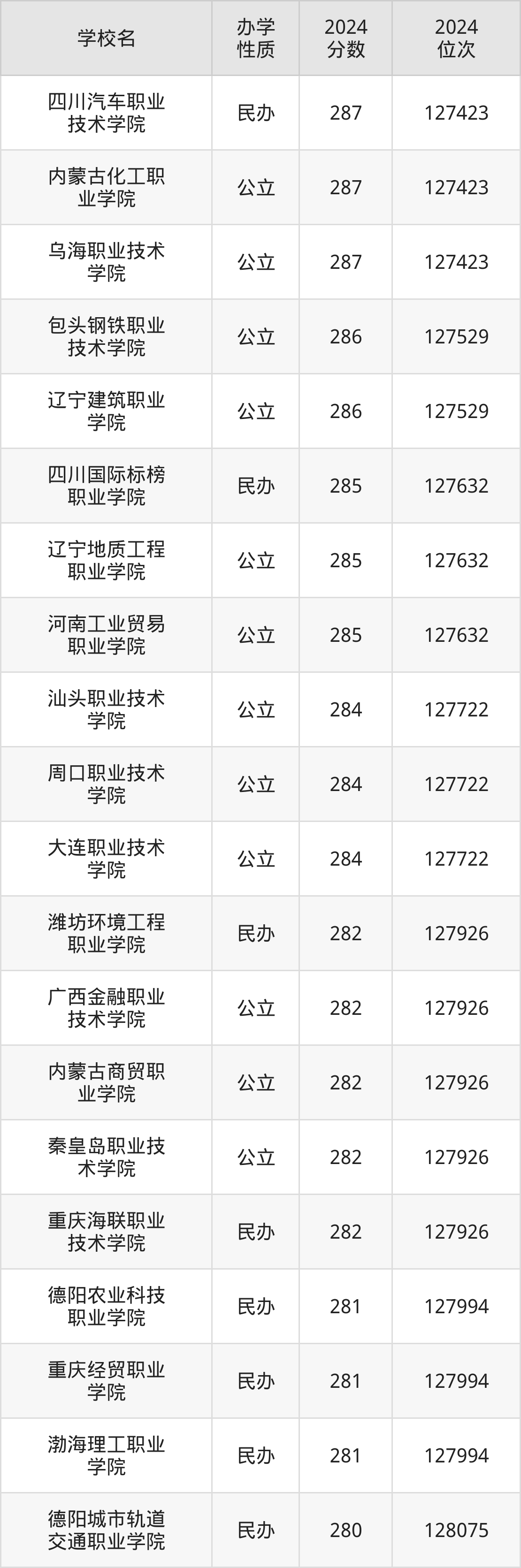 | 德阳城市轨道 交通职业学院 | 280 | 128075 |