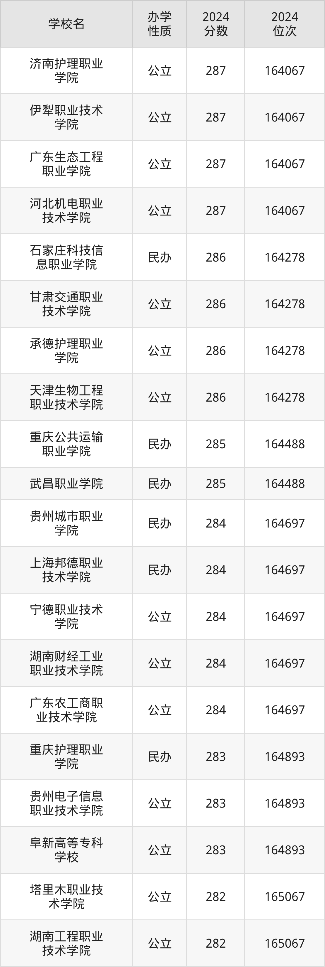 2024年云南理科282分考生能上济南护理职业学院、伊犁职业技术学院、广东生态工程职业学院、河北机电职业技术学院、石家庄科技信息职业学院等35所专科院校,具体录取分数线及位次为: