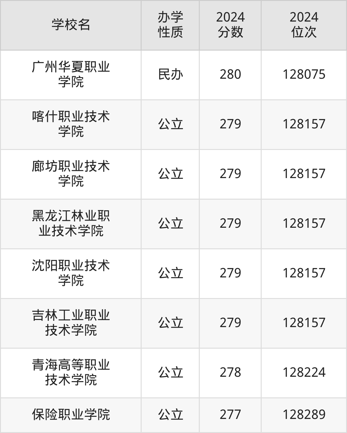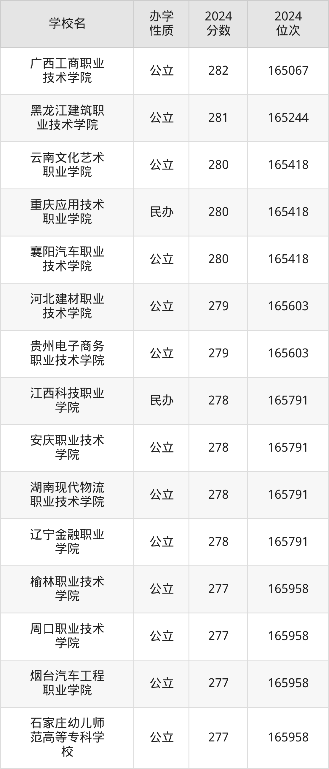 | 沈阳职业技术 学院 | 279 | 128157 |