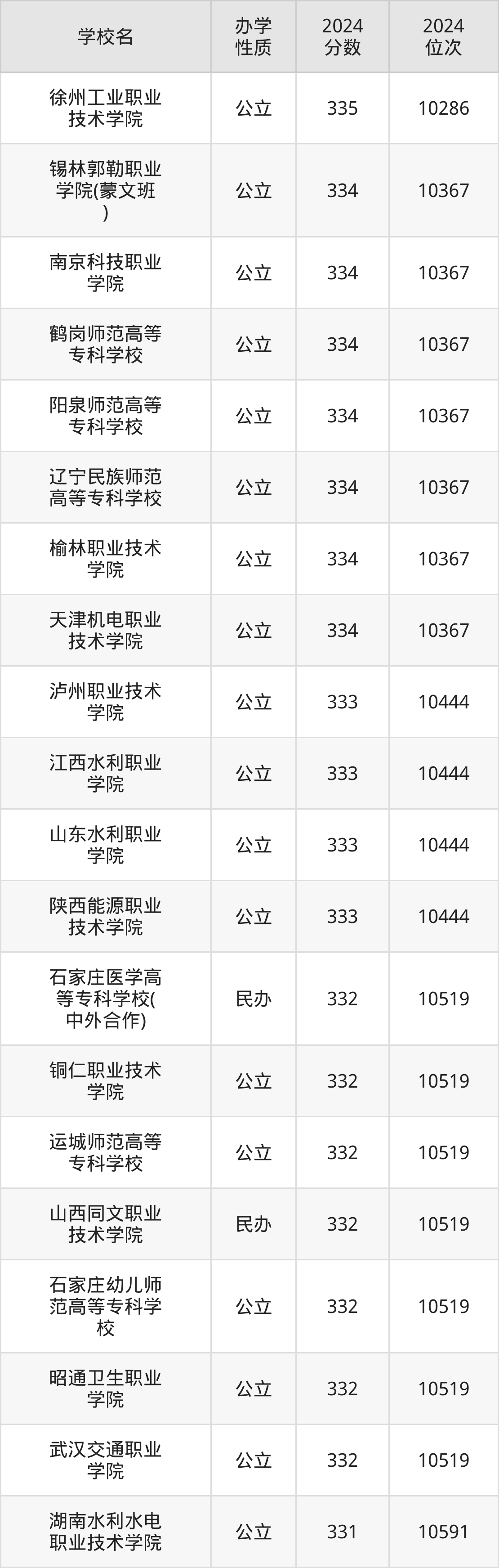 2024年青海文科330分考生能上徐州工业职业技术学院、锡林郭勒职业学院(蒙文班)、南京科技职业学院、鹤岗师范高等专科学校、阳泉师范高等专科学校等38所专科院校,具体录取分数线及位次为: