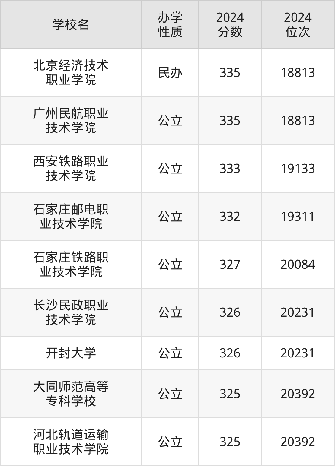 | 河北轨道运输 职业技术学院 | 325 | 20392 |