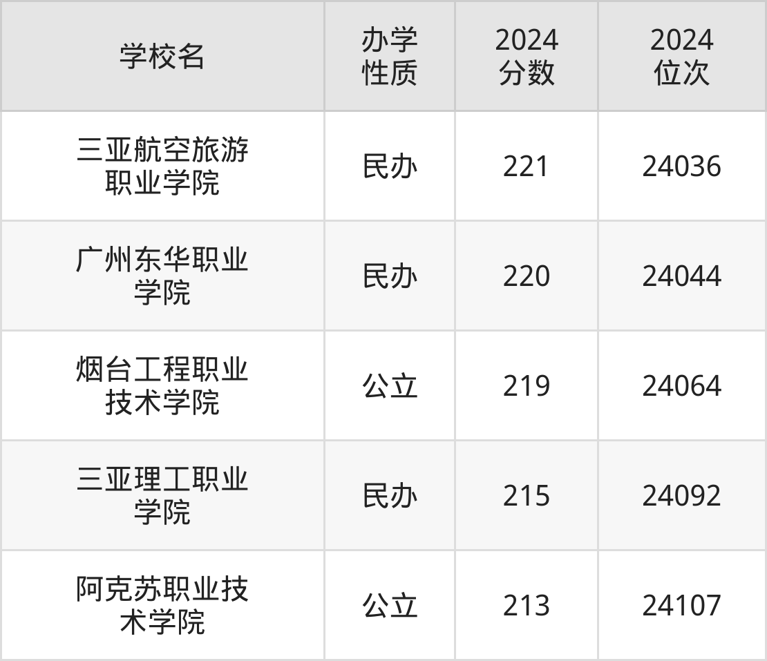 2024年宁夏文科216分考生能上三亚航空旅游职业学院、广州东华职业学院、烟台工程职业技术学院、三亚理工职业学院、阿克苏职业技术学院5所专科院校,具体录取分数线及位次为: