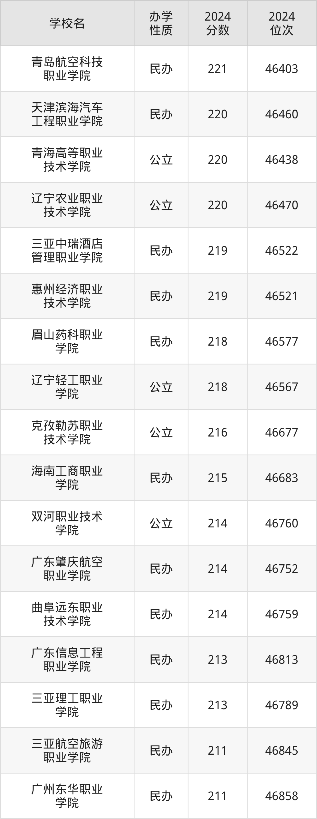 | 青岛航空科技 职业学院 | 221 | 46403 |