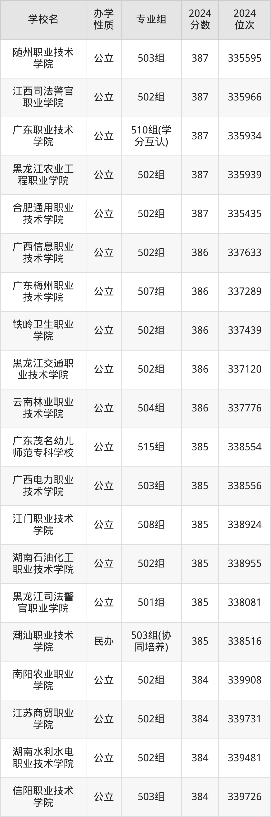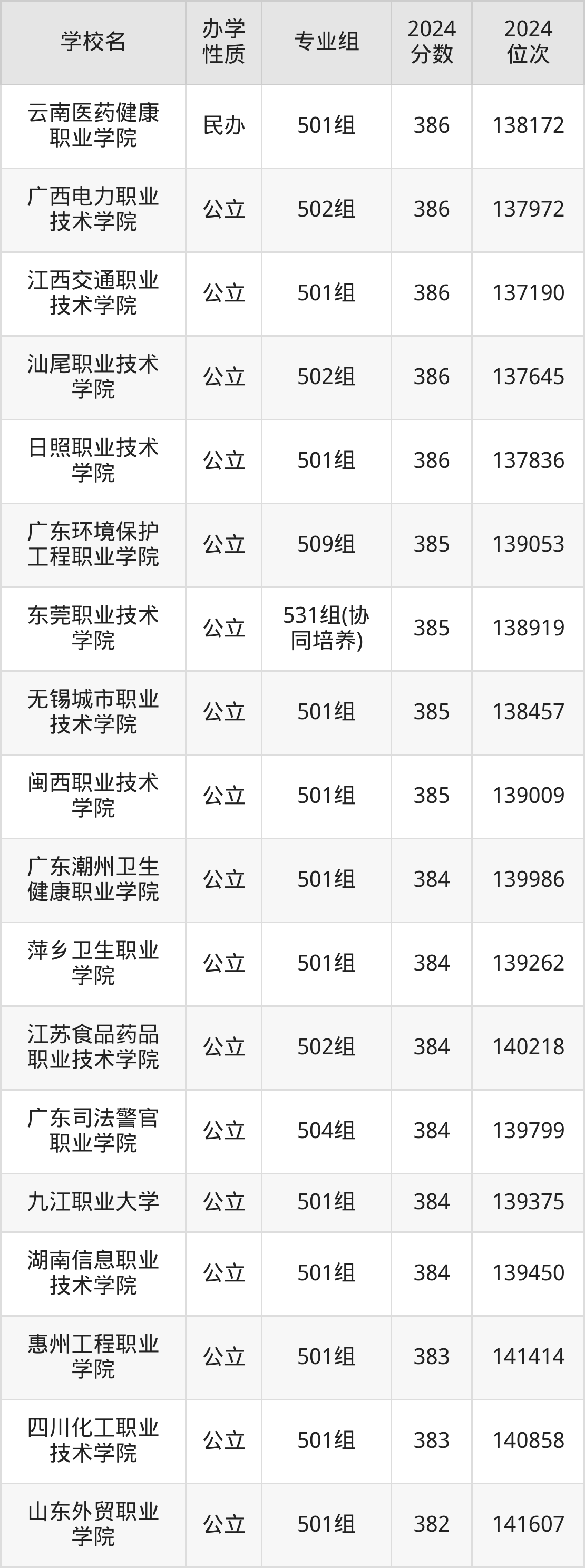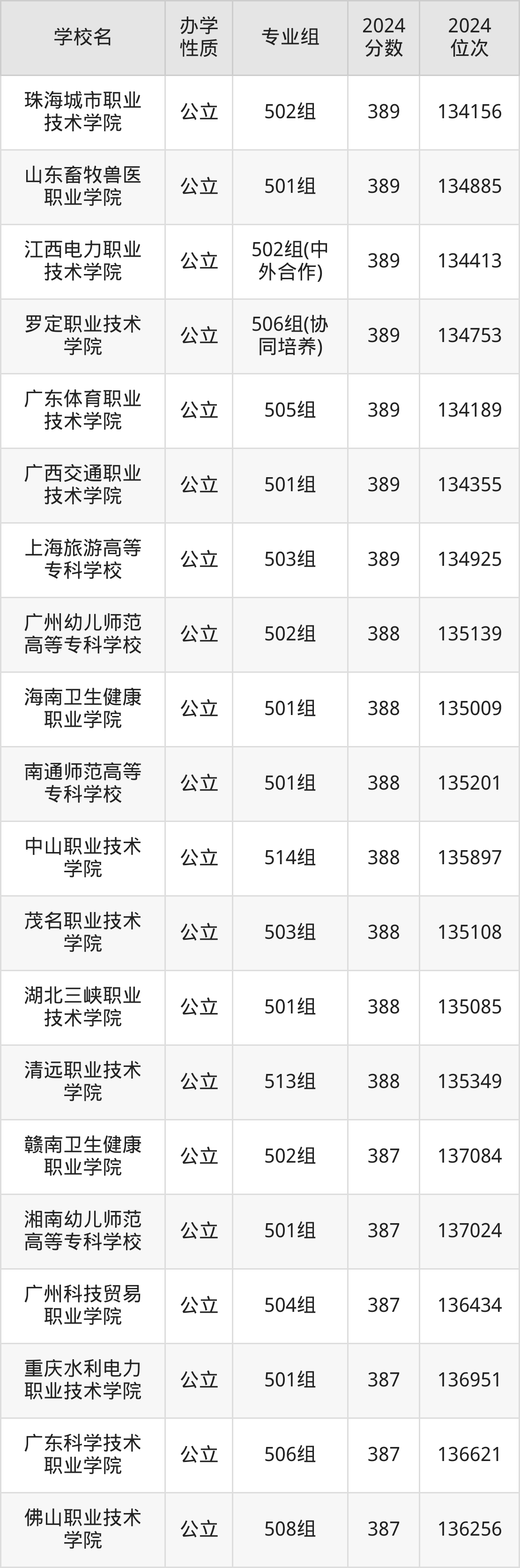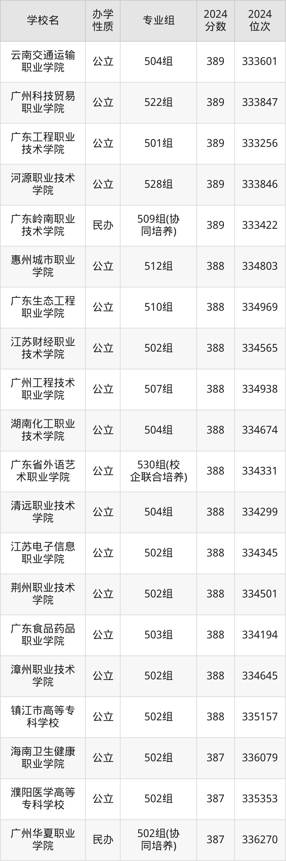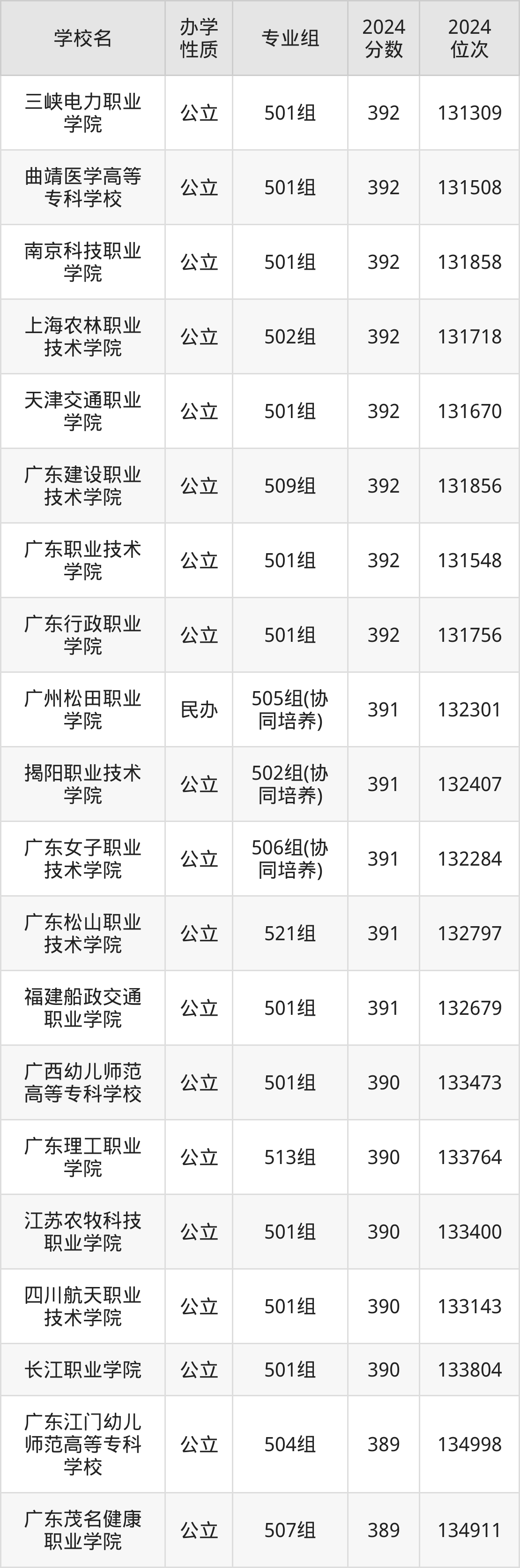 2024年广东历史类387分考生能上三峡电力职业学院、曲靖医学高等专科学校、南京科技职业学院、上海农林职业技术学院、天津交通职业学院等58所专科院校,具体录取分数线及位次为: