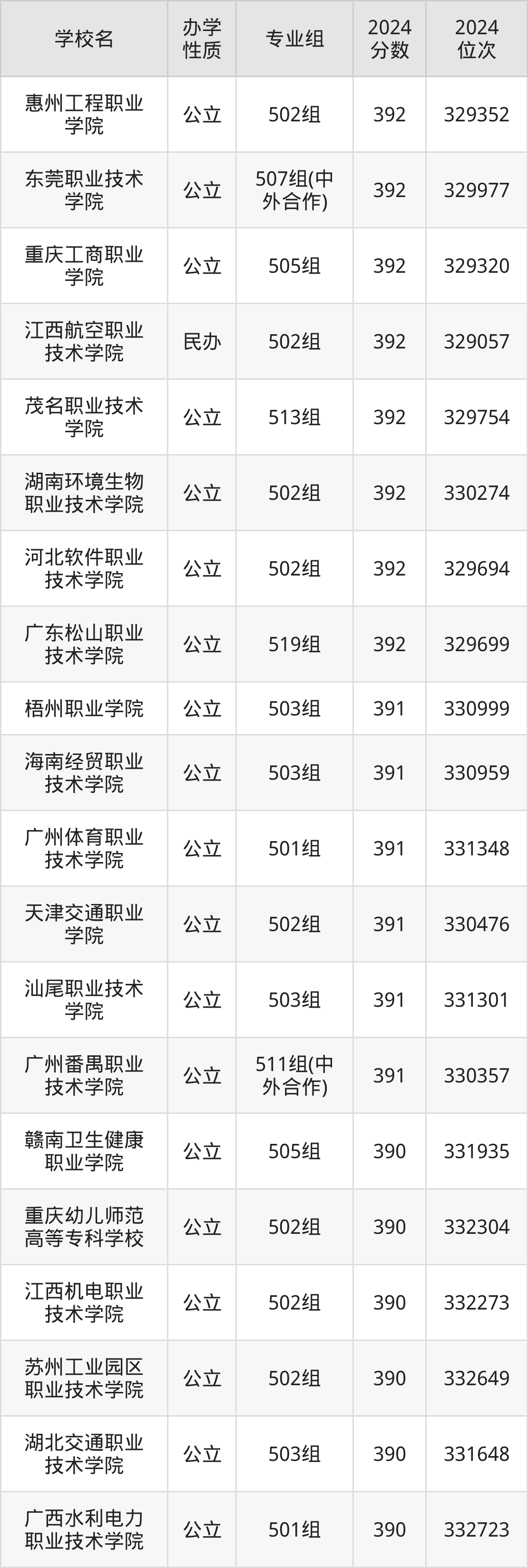 2024年广东物理类387分考生能上惠州工程职业学院、东莞职业技术学院、重庆工商职业学院、江西航空职业技术学院、茂名职业技术学院等79所专科院校,具体录取分数线及位次为: