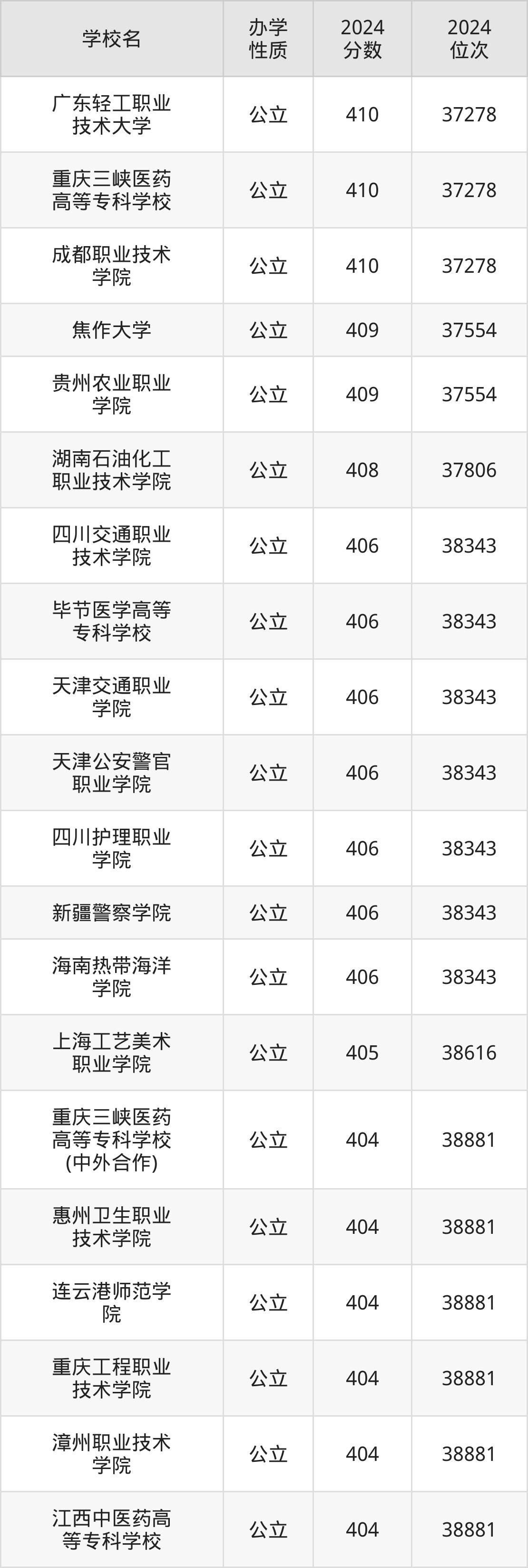 重庆405分左右的考生可以上广东轻工职业技术大学、重庆三峡医药高等专科学校、成都职业技术学院等院校,刚好在405分的院校有上海工艺美术职业学院。