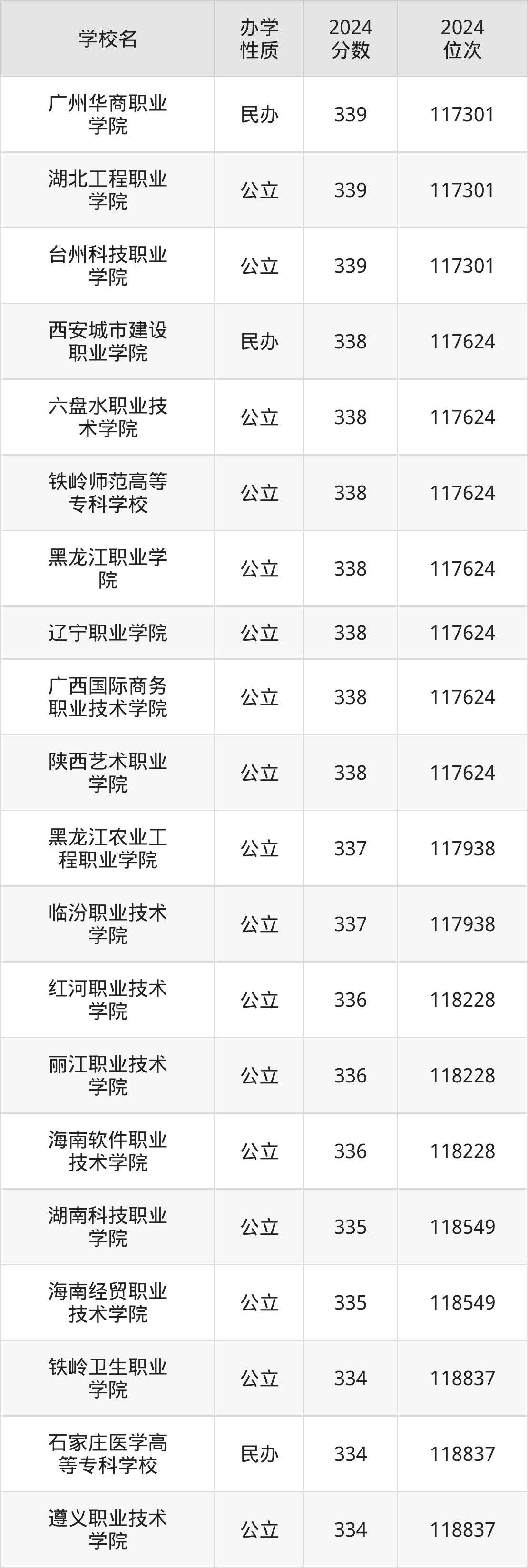 | 陕西艺术职业 学院 | 338 | 117624 |