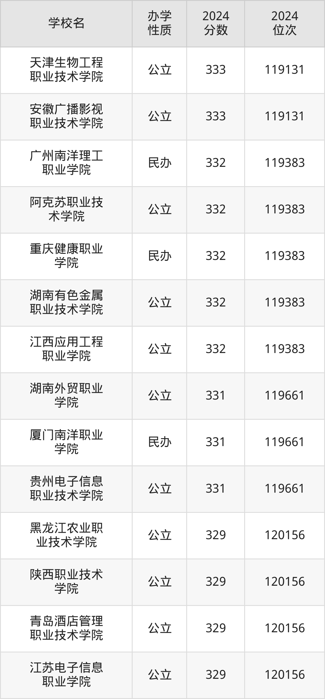 | 安徽粮食工程 职业学院 | 330 | 152356 |
