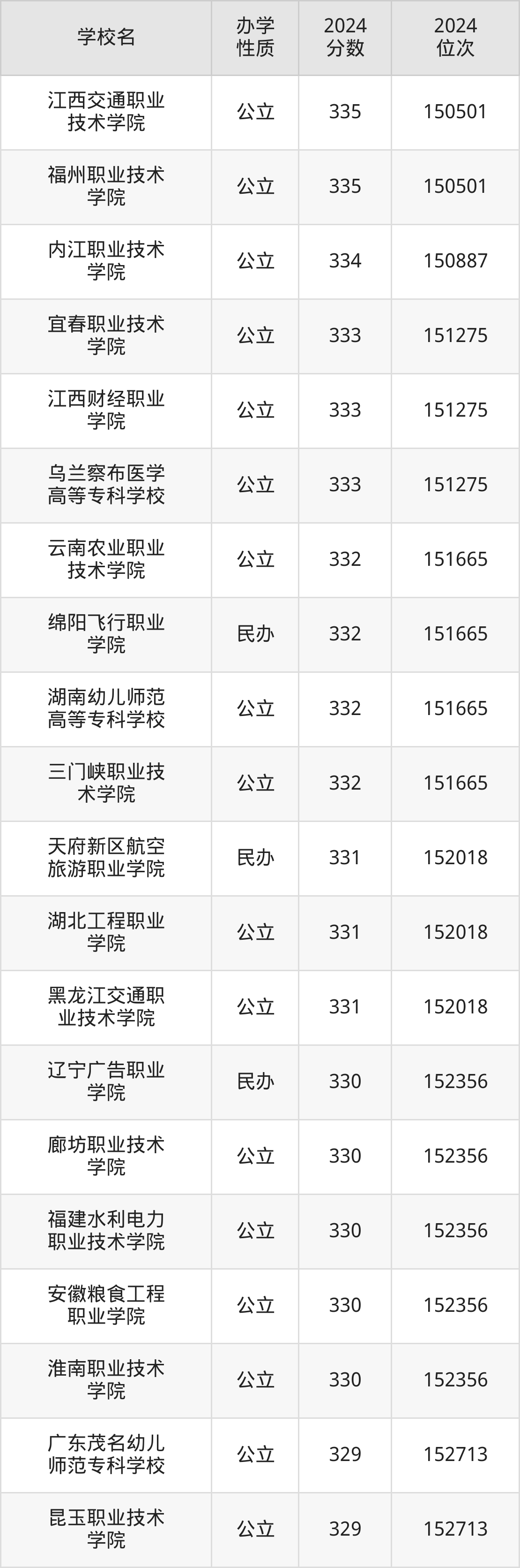 | 福建水利电力 职业技术学院 | 330 | 152356 |