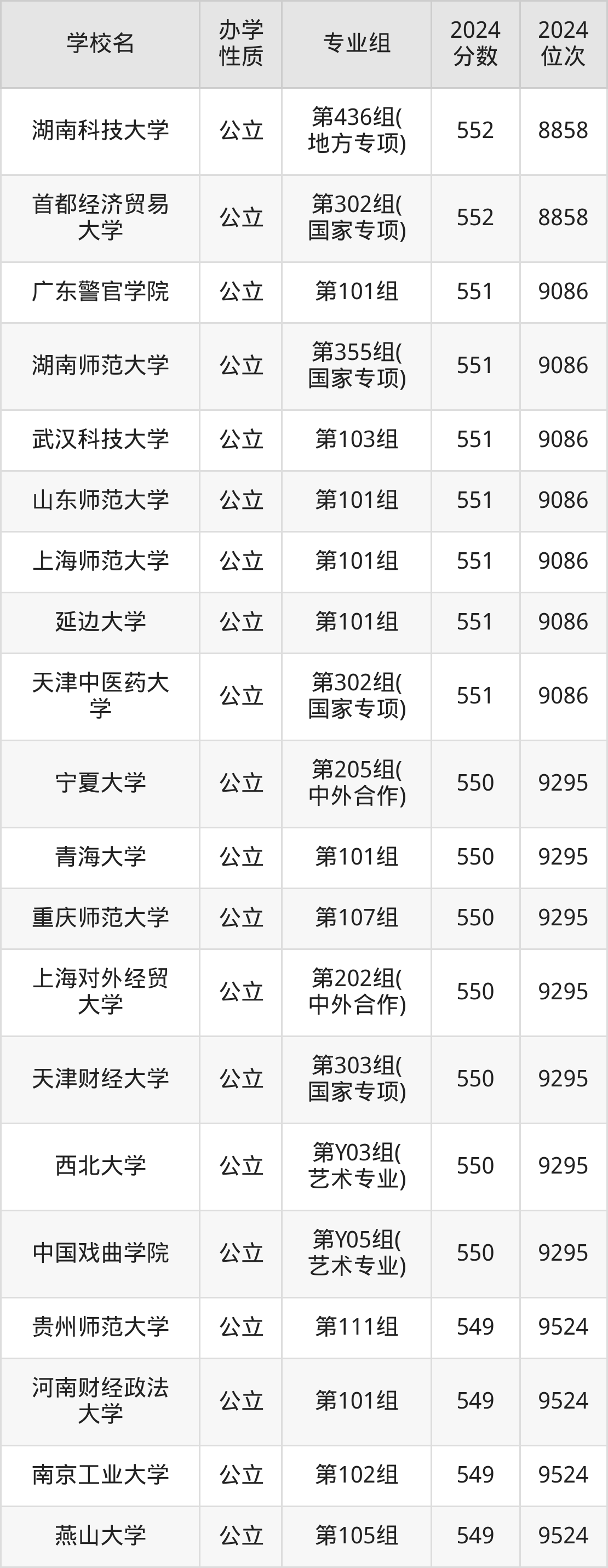为了方便2025届考生了解自己能上哪些大学,本文也整理出了湖南552分左右能上的所有大学名单,供2025年考生参考。