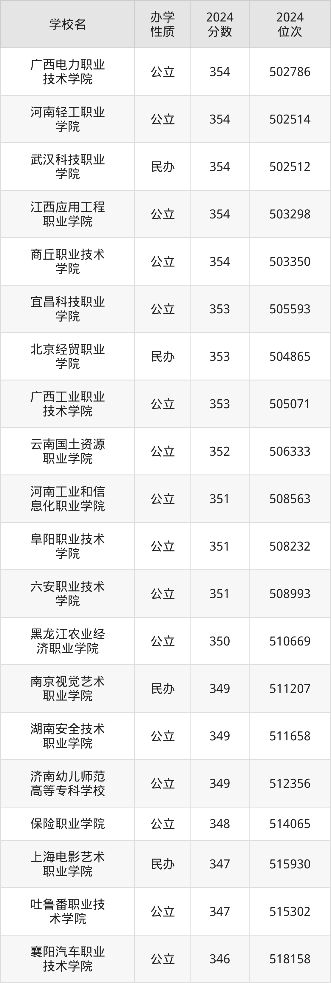 2024年山东349分考生能上广西电力职业技术学院、河南轻工职业学院、武汉科技职业学院、江西应用工程职业学院、商丘职业技术学院等29所专科院校,具体录取分数线及位次为: