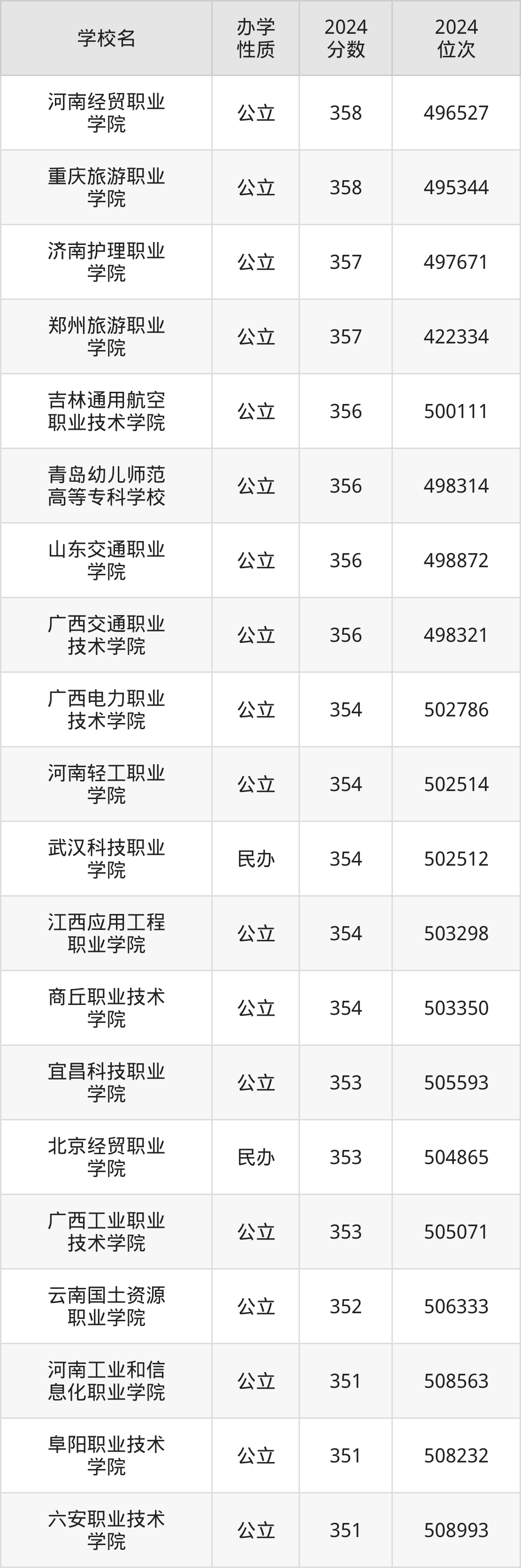 | 河南经贸职业 学院 | 358 | 496527 |