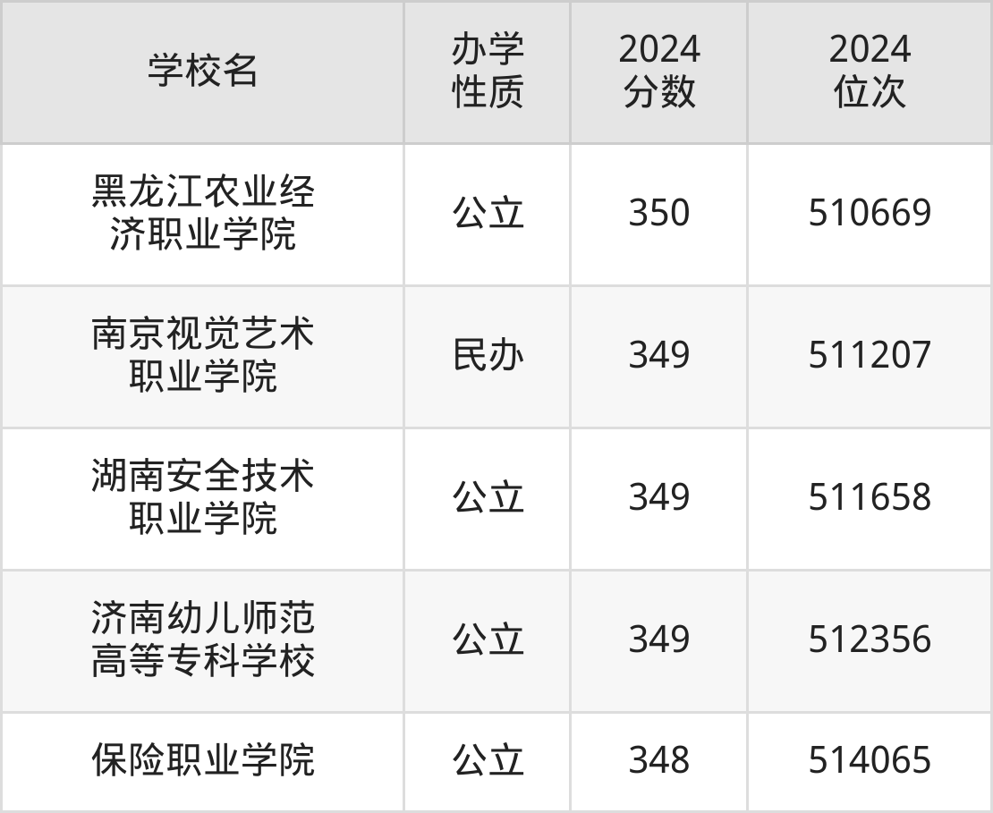 | 黑龙江农业经 济职业学院 | 350 | 510669 |
