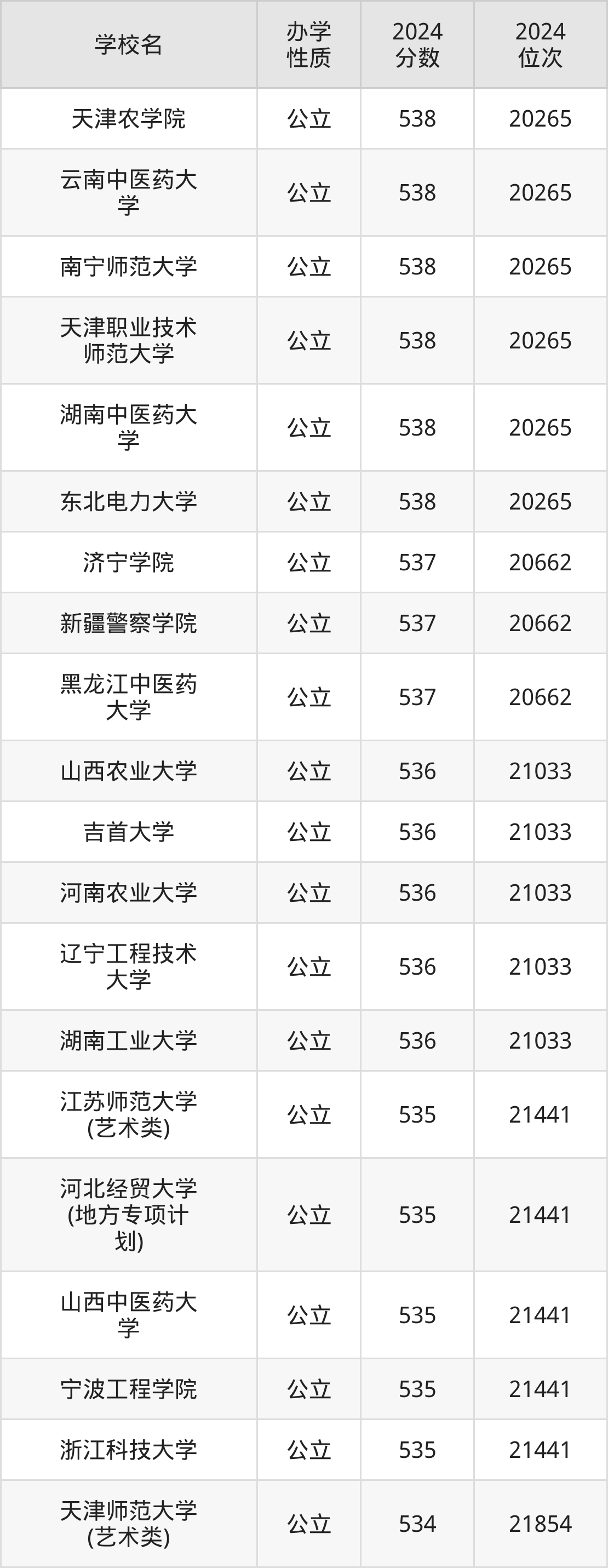 2024年河北历史类533分考生能上天津农学院、云南中医药大学、南宁师范大学、天津职业技术师范大学、湖南中医药大学等85所一本院校,具体录取分数线及位次为: