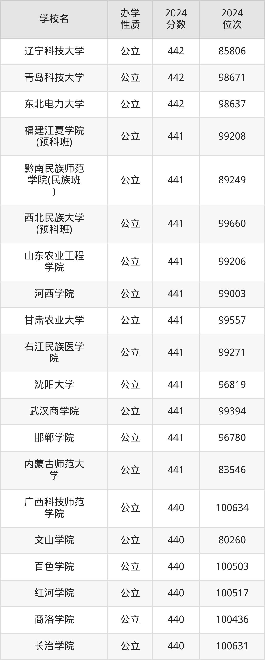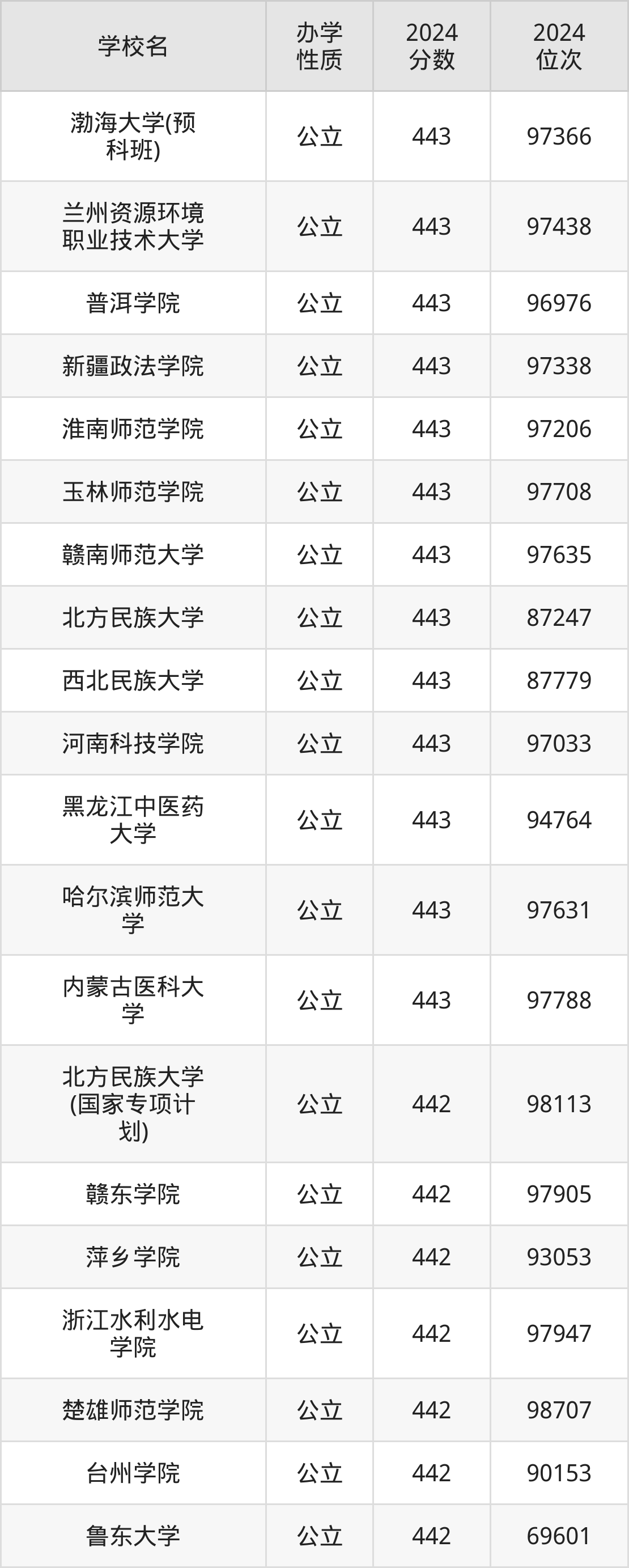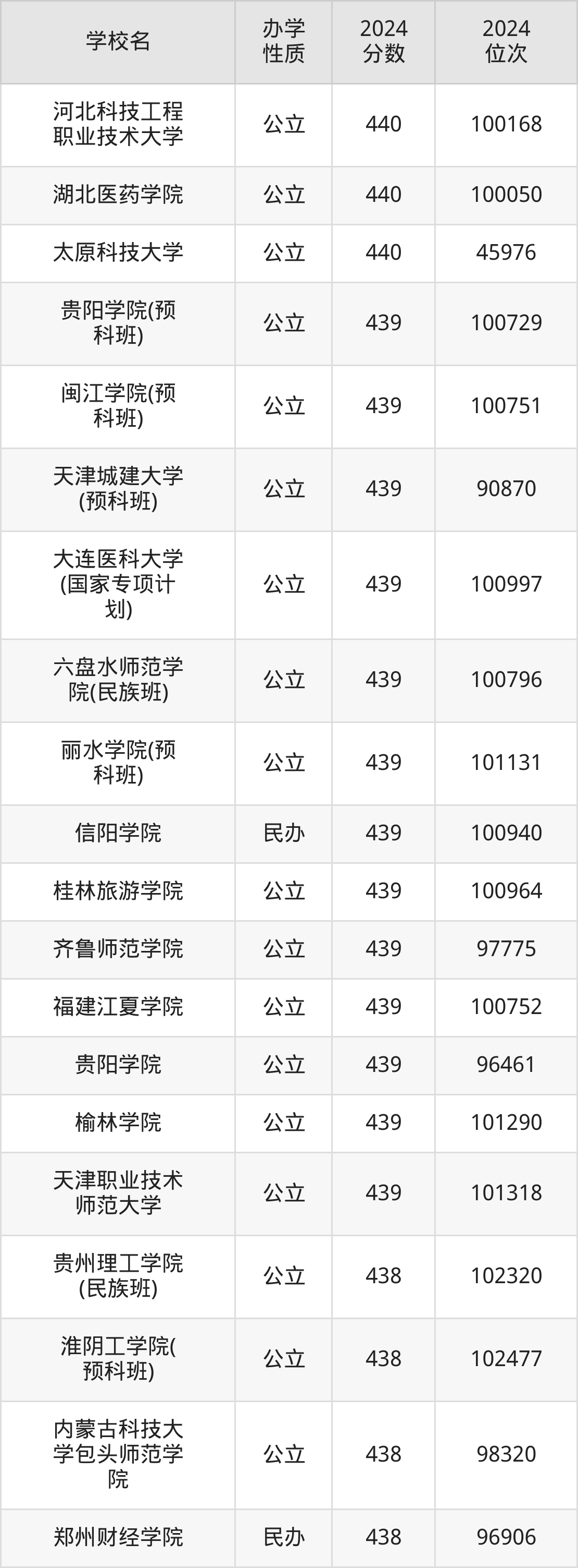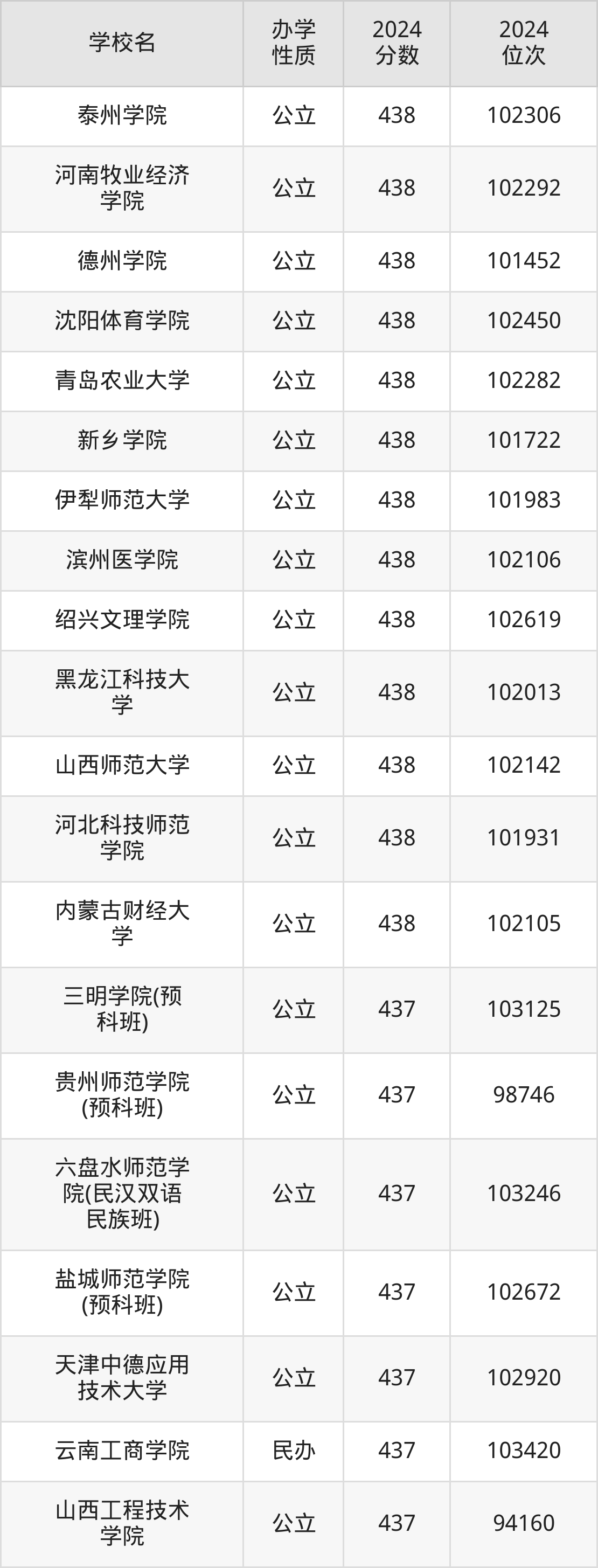 2024年贵州物理类438分考生能上渤海大学(预科班)、兰州资源环境职业技术大学、普洱学院、新疆政法学院、淮南师范学院等141所二本院校,具体录取分数线及位次为: