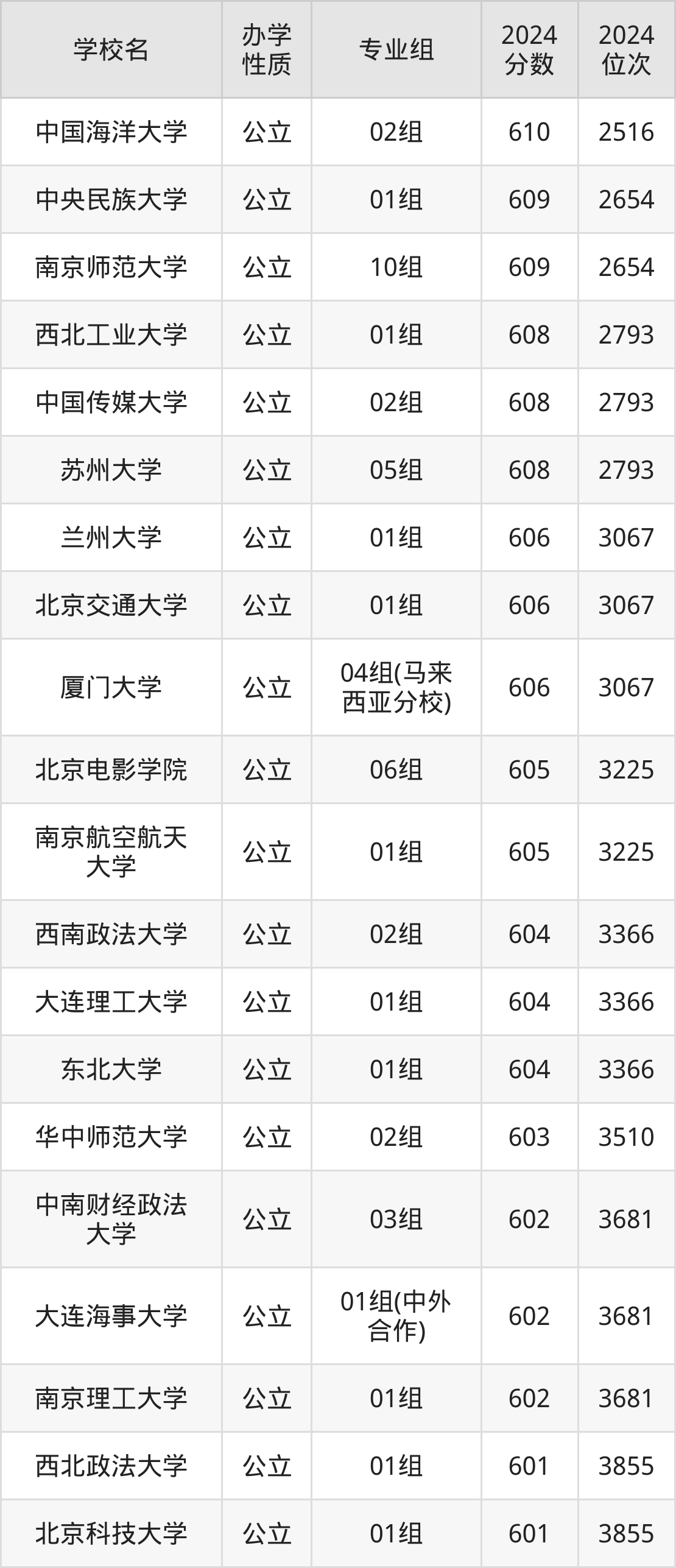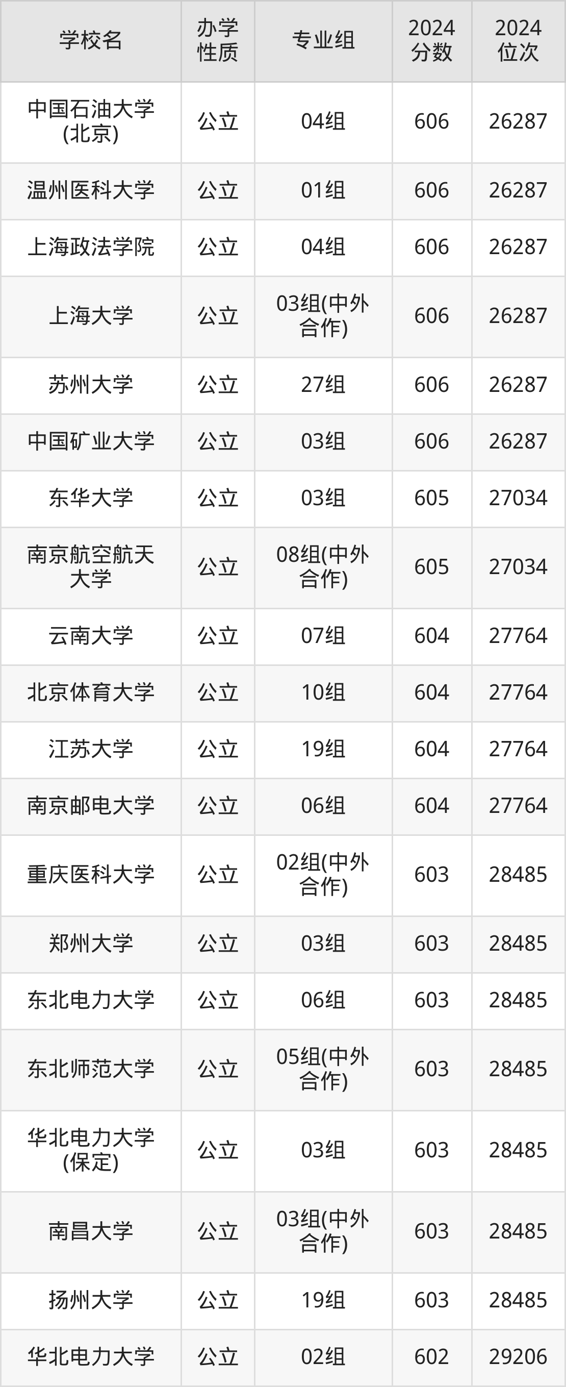 2024年江苏物理类605分考生能上中央民族大学、西北农林科技大学2所985院校,具体录取分数线及位次为: