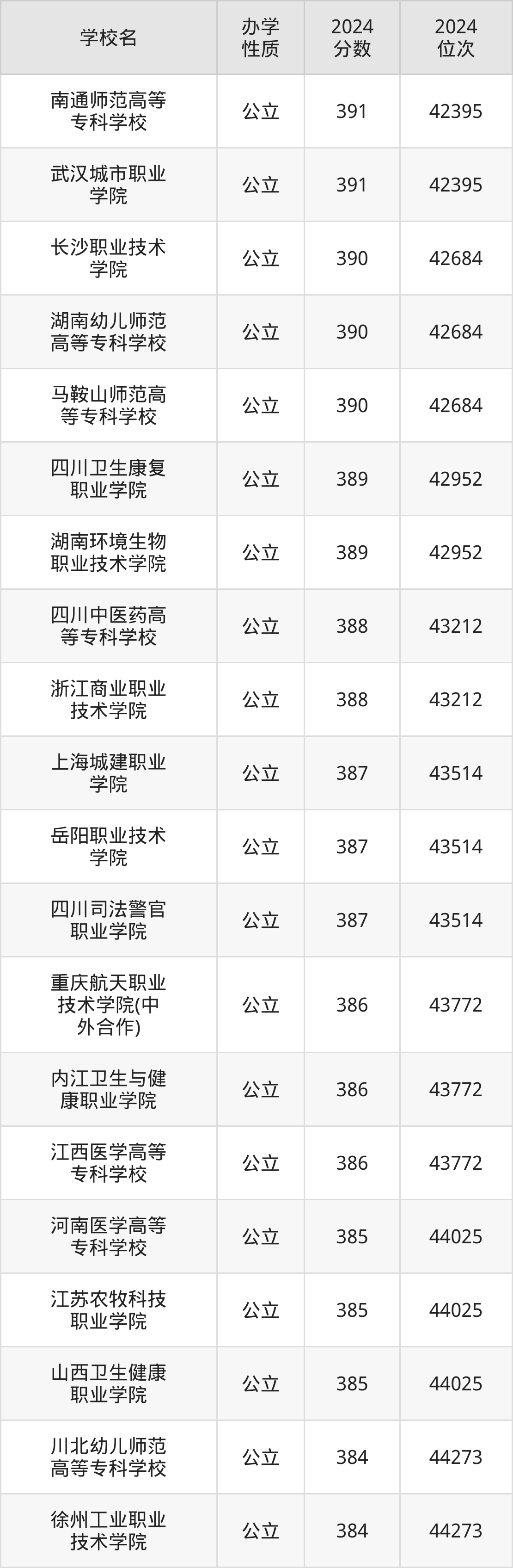 | 四川卫生康复 职业学院 | 389 | 42952 |