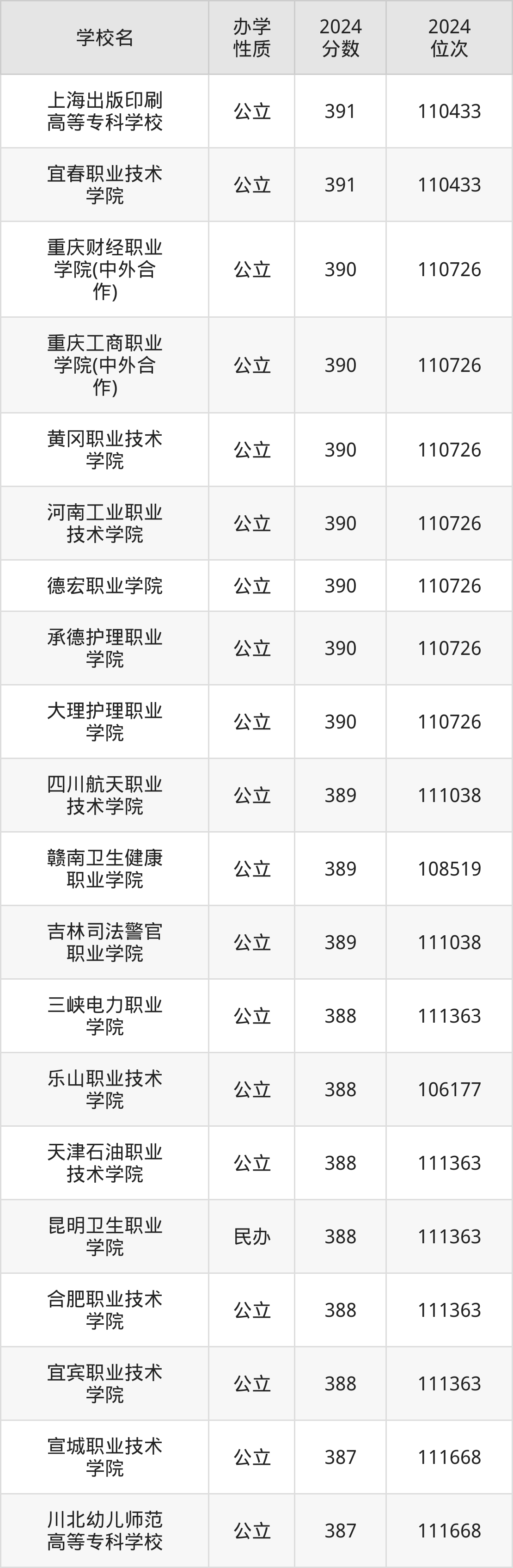 | 三峡电力职业 学院 | 388 | 111363 |