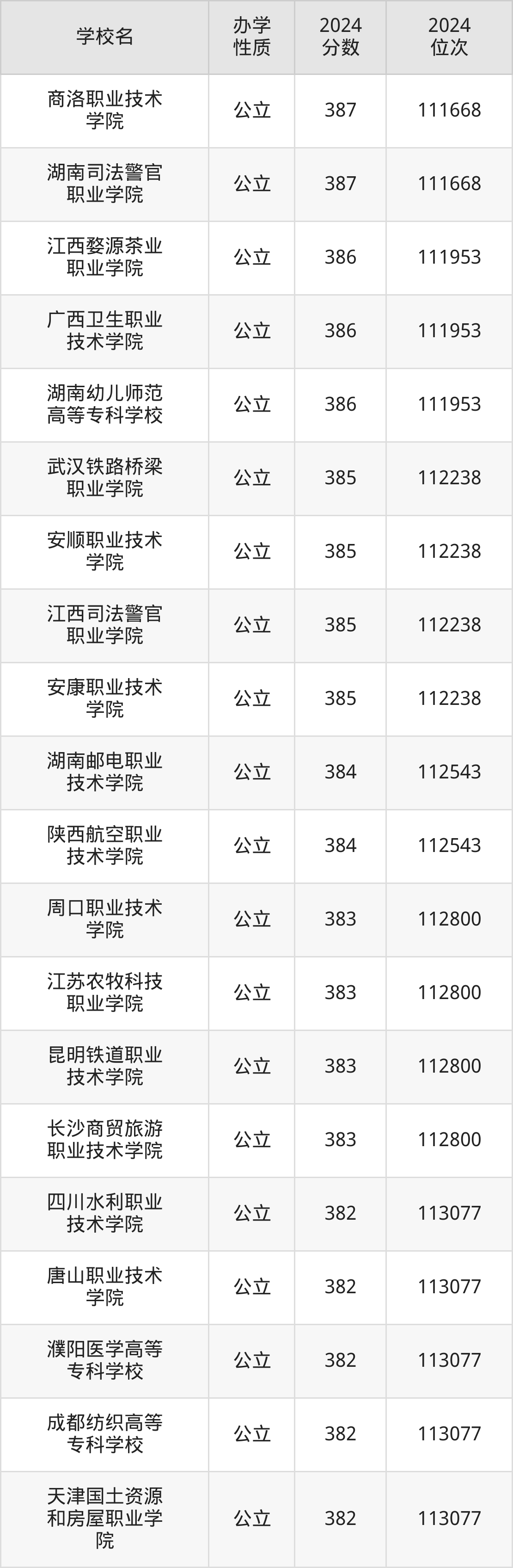 | 安康职业技术 学院 | 385 | 112238 |