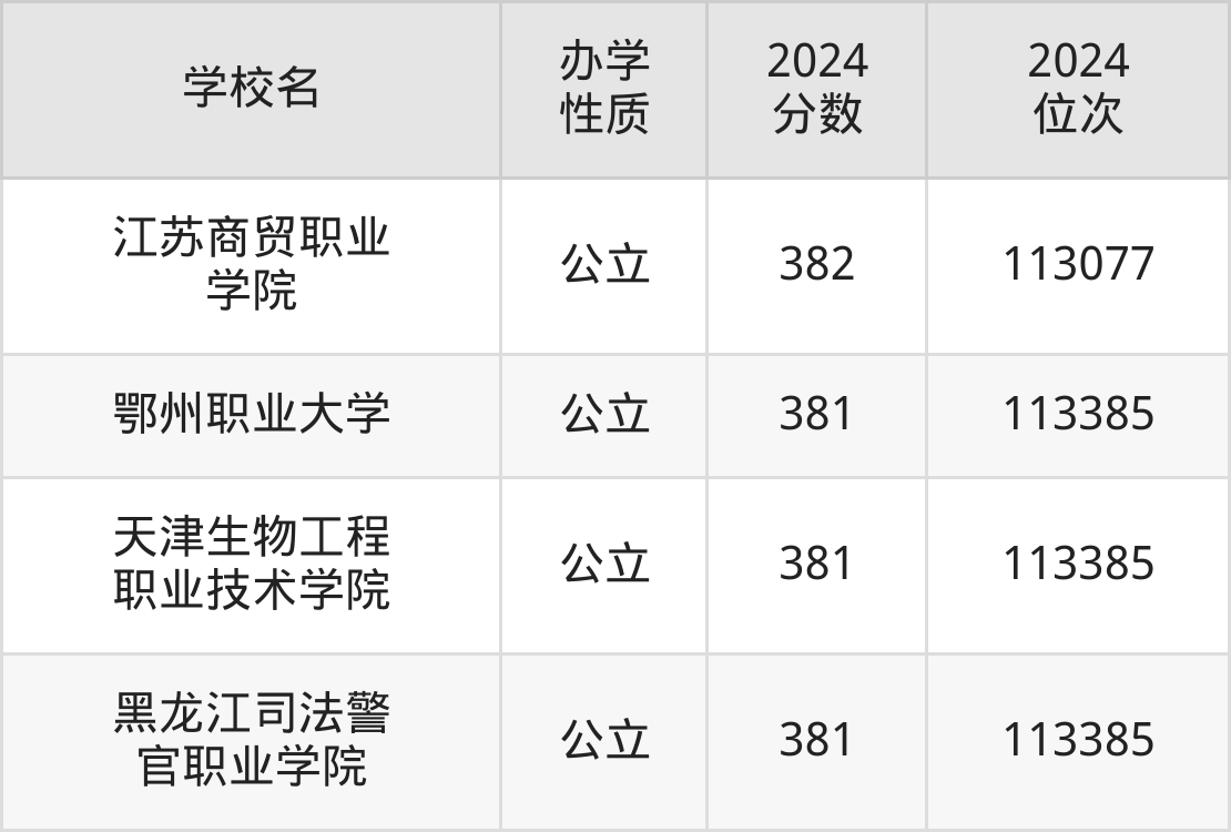 | 黑龙江司法警 官职业学院 | 381 | 113385 |