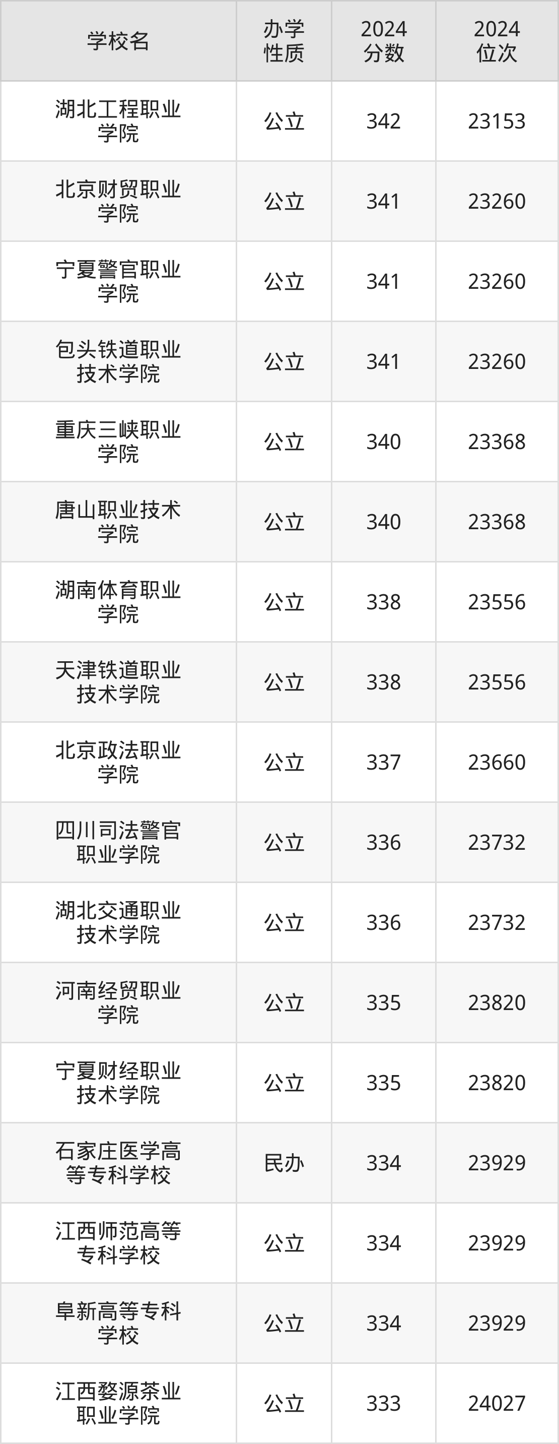 2024年内蒙古文科337分考生能上湖北工程职业学院、北京财贸职业学院、宁夏警官职业学院、包头铁道职业技术学院、重庆三峡职业学院等14所专科院校,具体录取分数线及位次为: