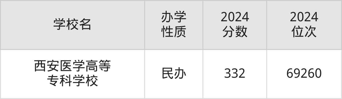 | 西安医学高等 专科学校 | 332 | 69260 |