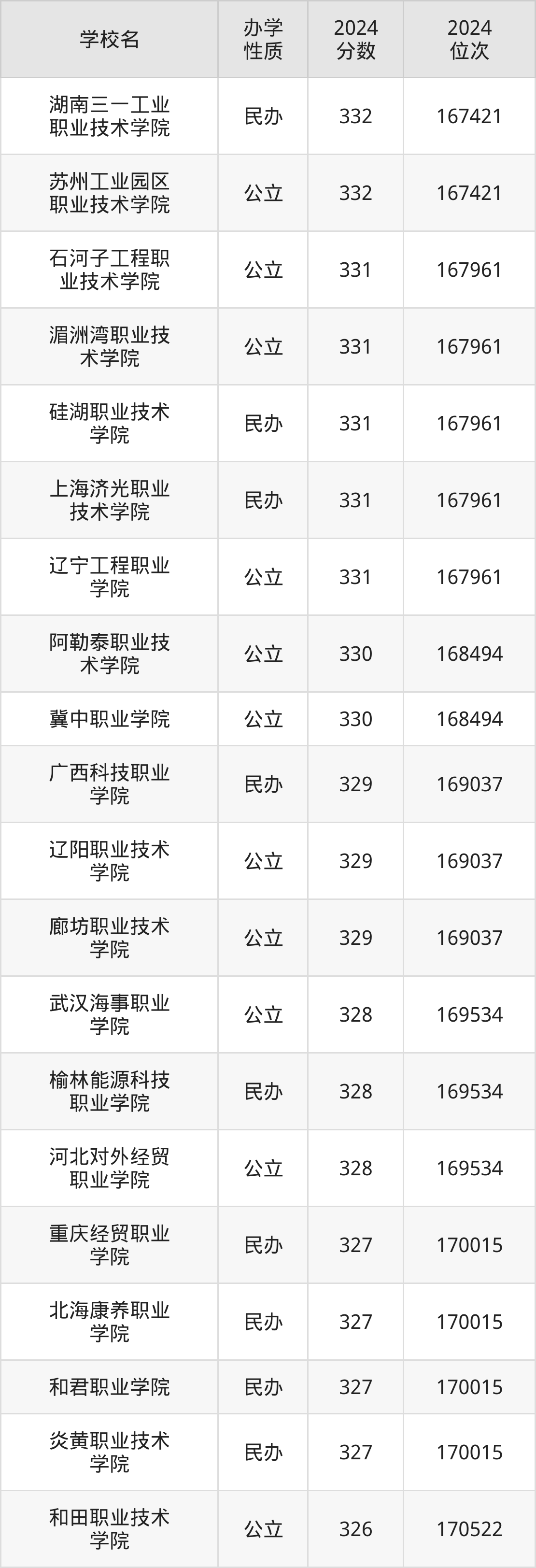 | 冀中职业学院 | 330 | 168494 |