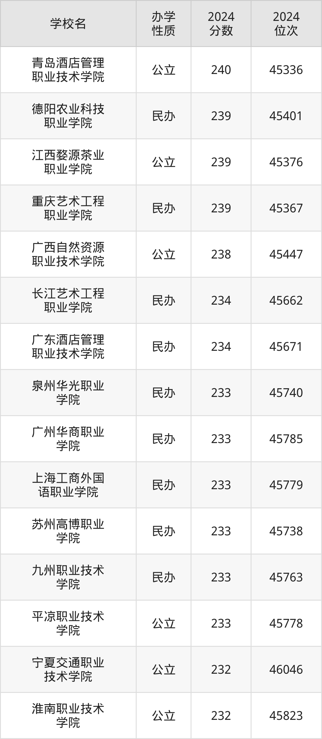 | 青岛酒店管理 职业技术学院 | 240 | 45336 |