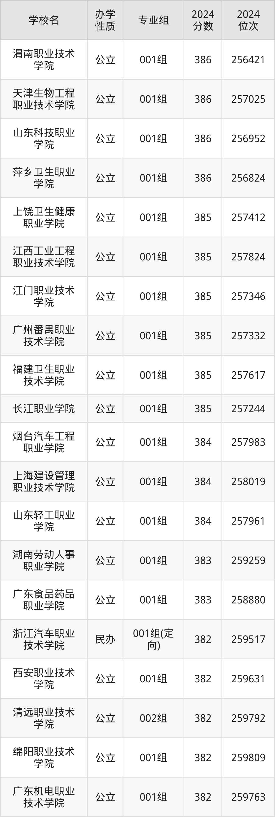 | 浙江汽车职业 技术学院 | 001组(定 向) | 382 | 259517 |
