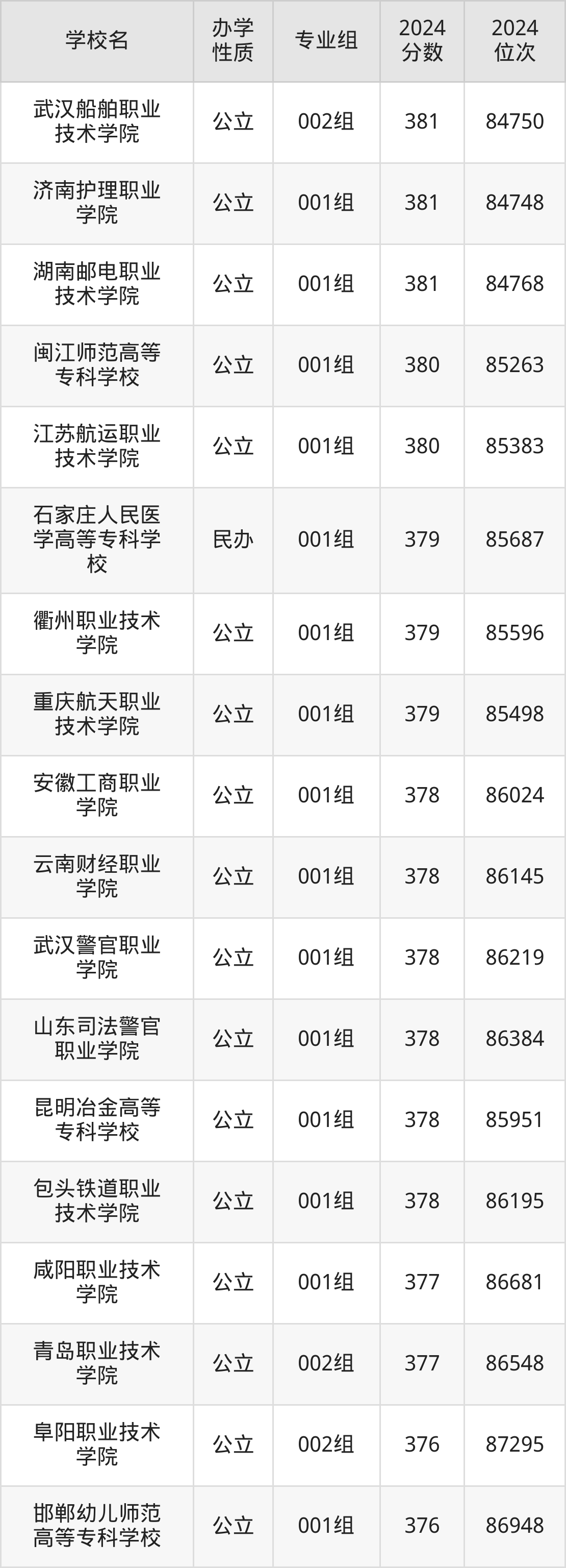 | 武汉警官职业 学院 | 001组 | 378 | 86219 |