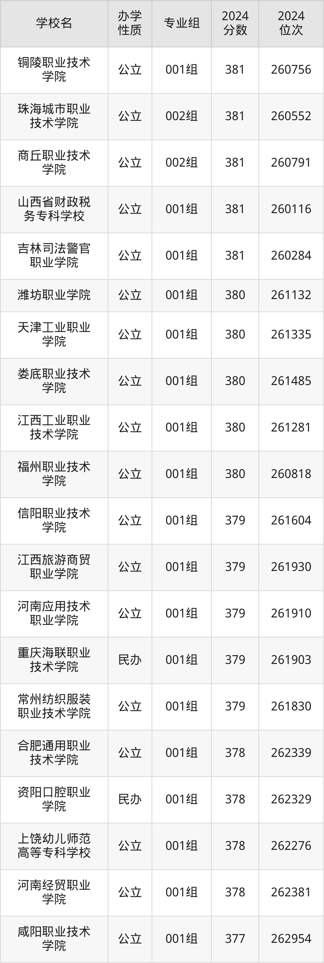 | 江西工业职业 技术学院 | 001组 | 380 | 261281 |