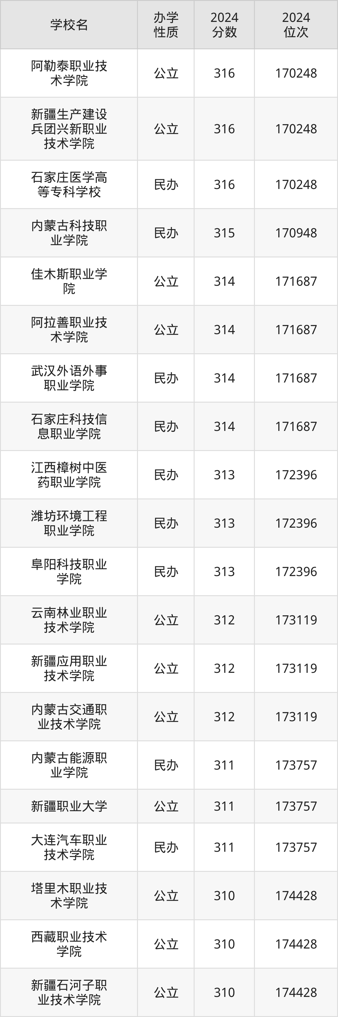 | 新疆石河子职 业技术学院 | 310 | 174428 |