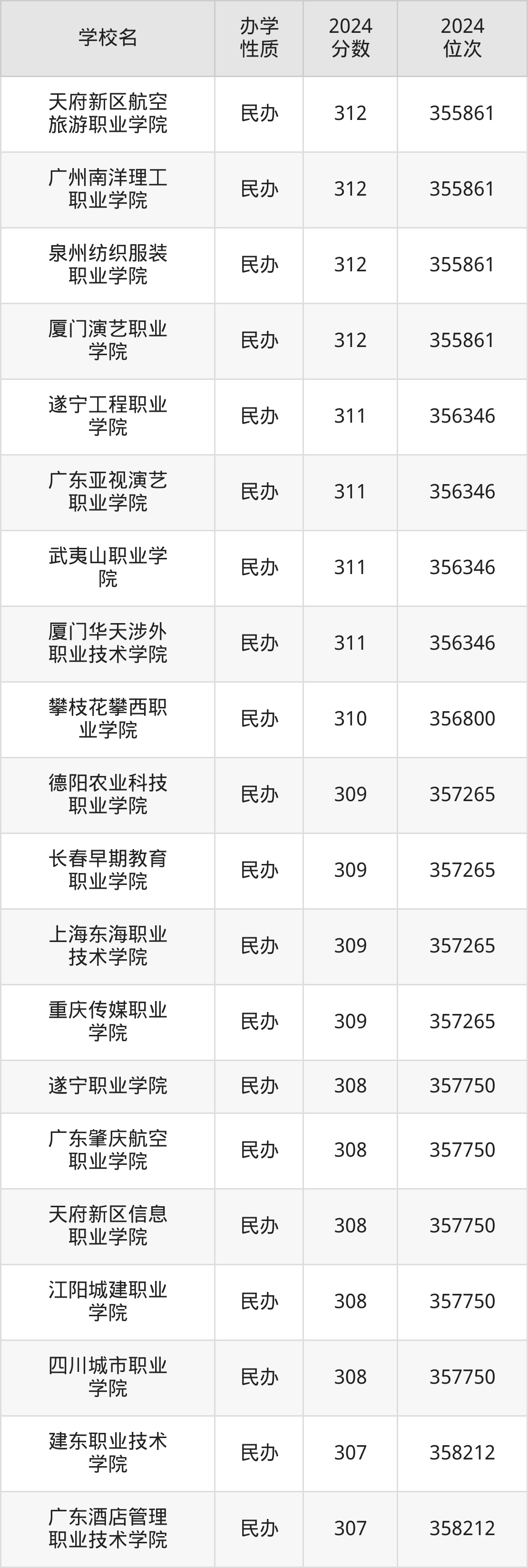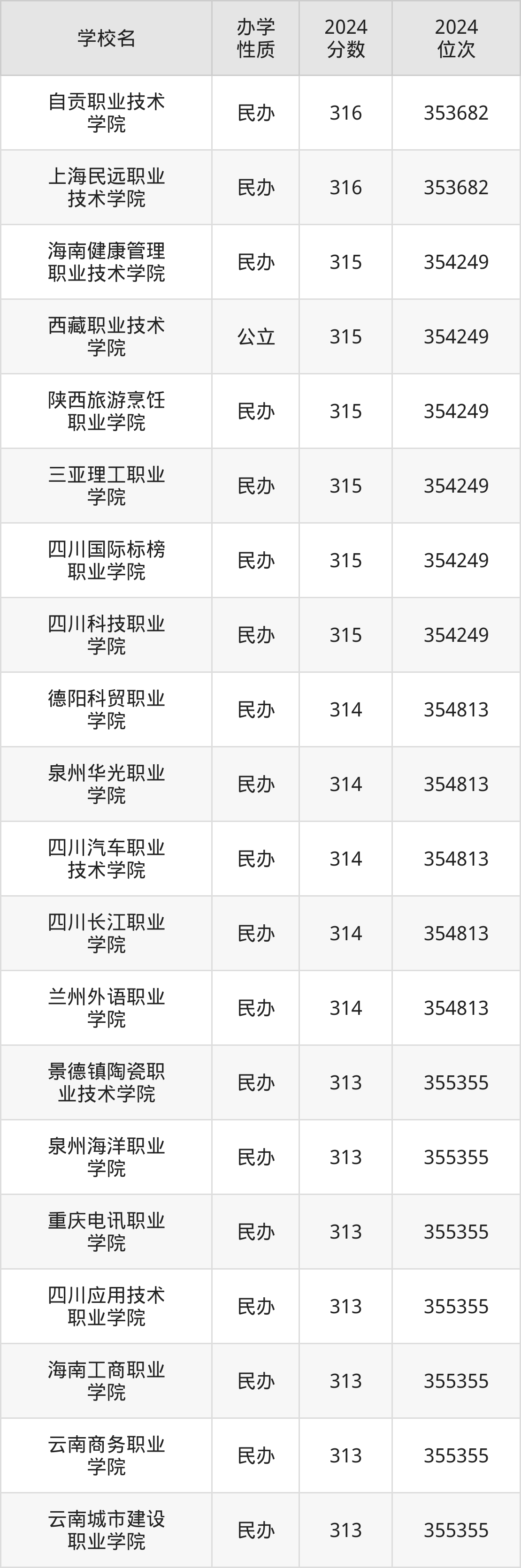 | 四川长江职业 学院 | 314 | 354813 |