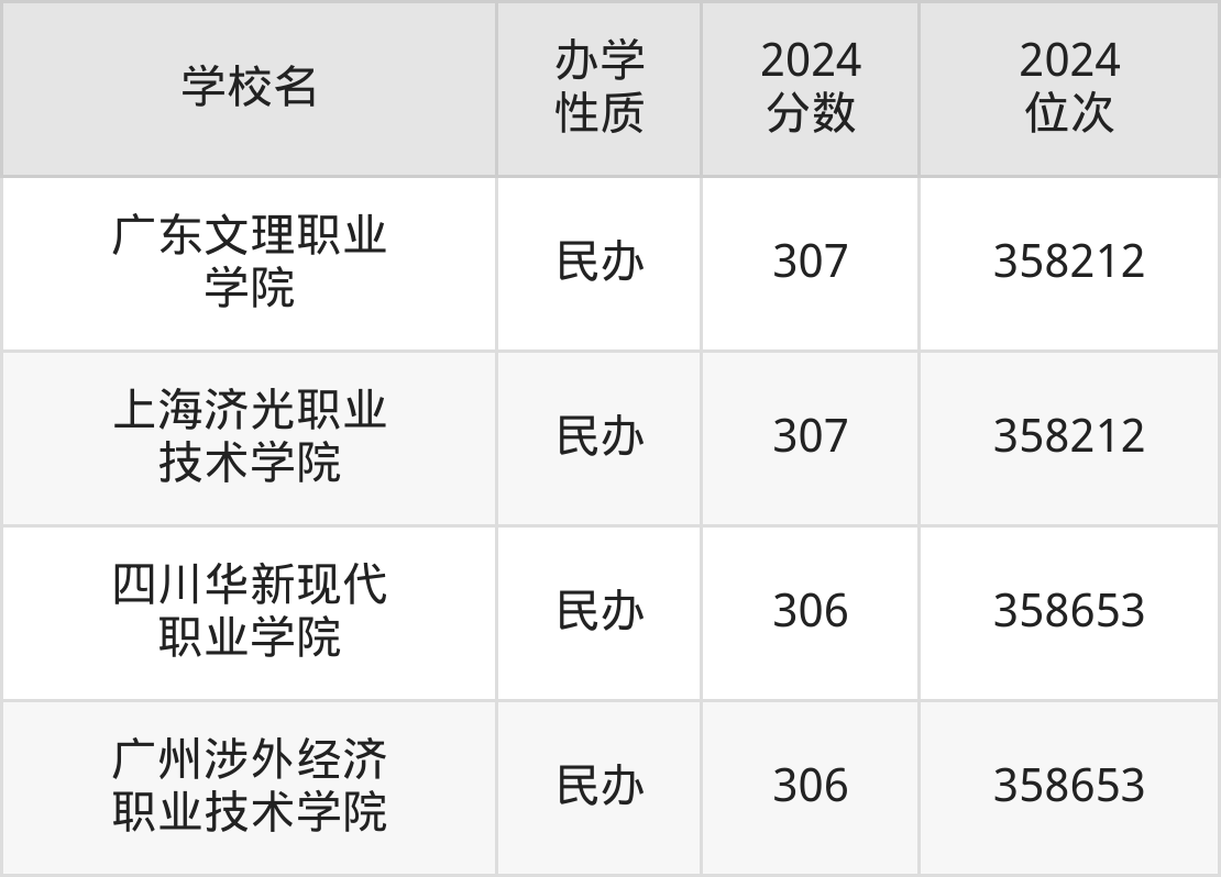 | 广东文理职业 学院 | 307 | 358212 |