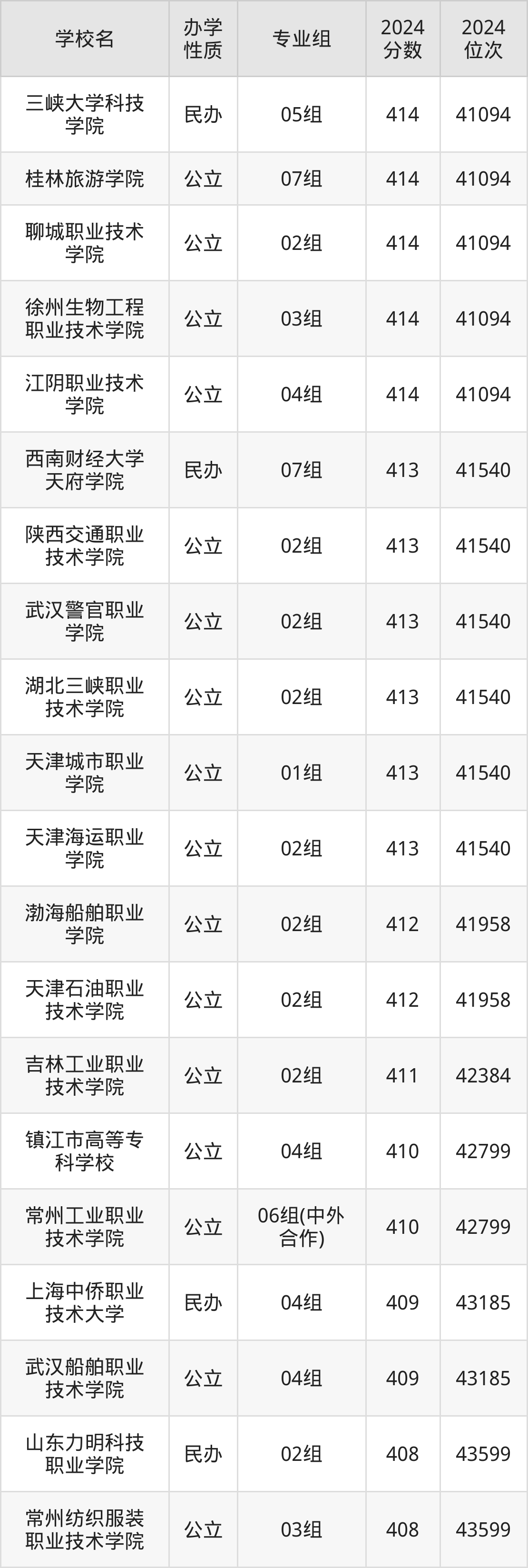 江苏409分左右的考生可以上三峡大学科技学院、桂林旅游学院、聊城职业技术学院等院校,刚好在409分的院校有上海中侨职业技术大学、武汉船舶职业技术学院。