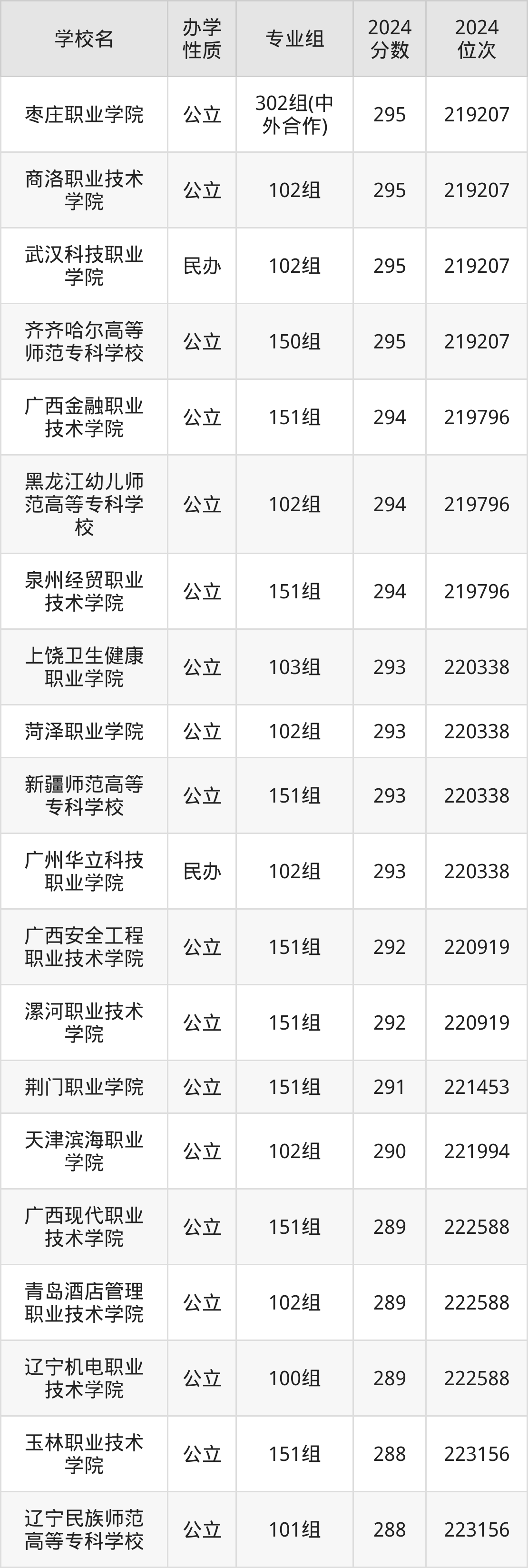 | 枣庄职业学院 | 302组(中 外合作) | 295 | 219207 |