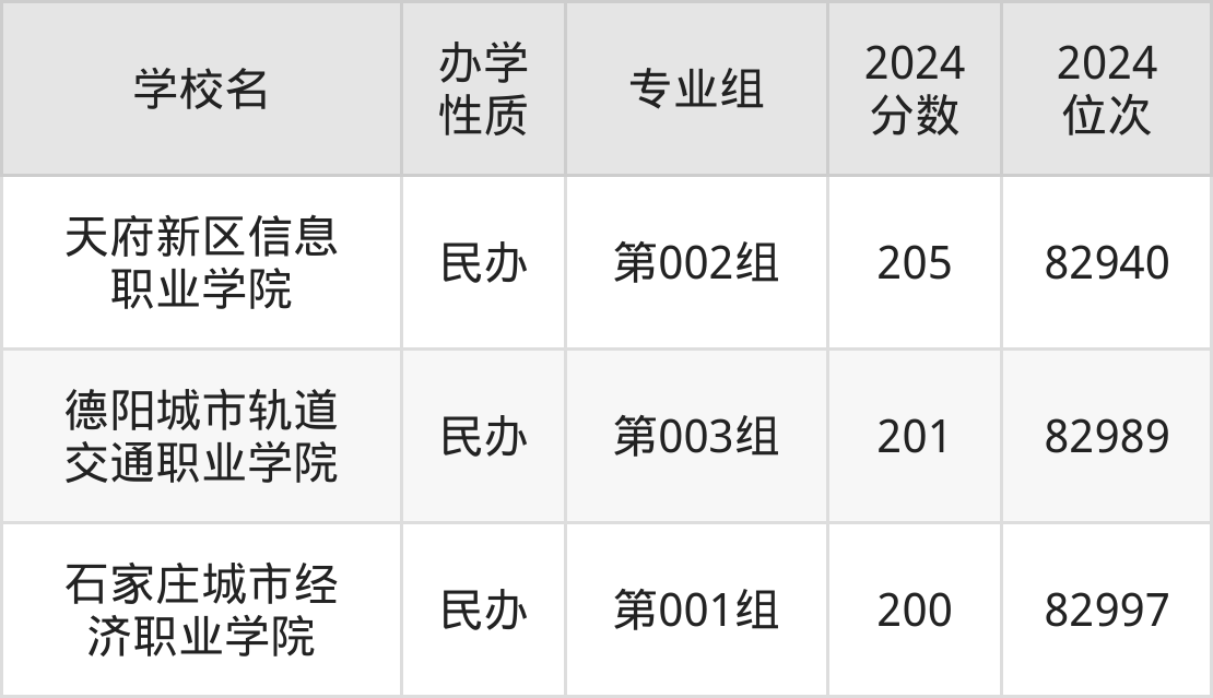 2024年吉林物理类200分考生能上天府新区信息职业学院、德阳城市轨道交通职业学院、石家庄城市经济职业学院3所专科院校,具体录取分数线及位次为: