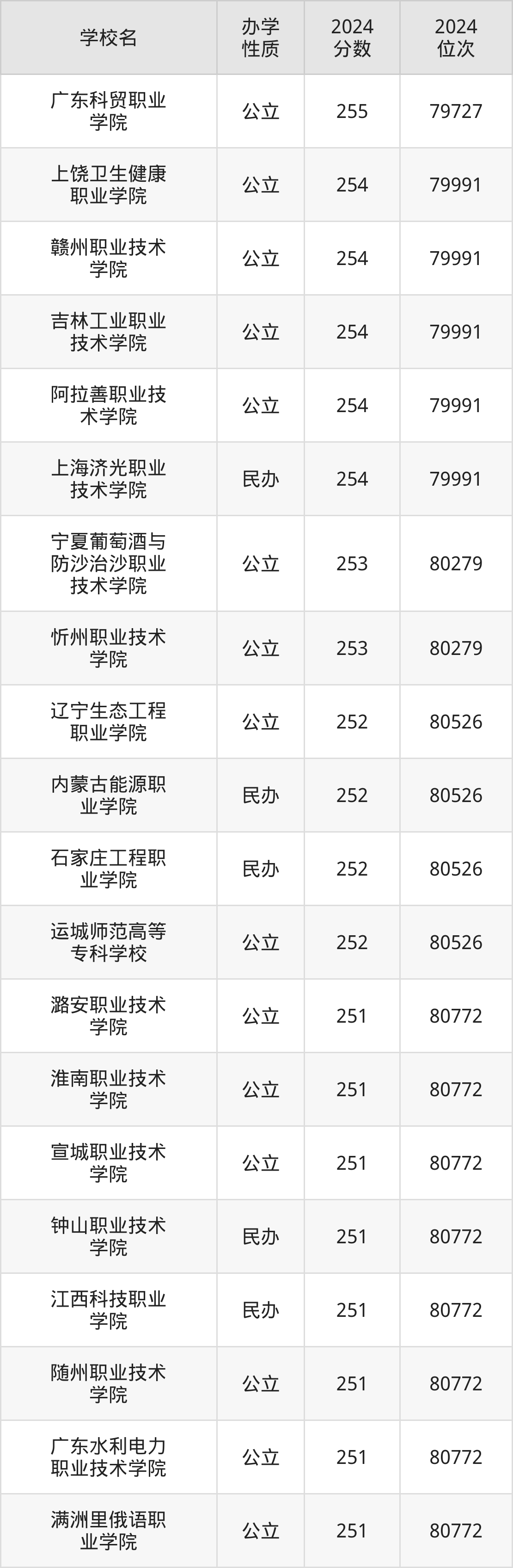 | 广东水利电力 职业技术学院 | 251 | 80772 |