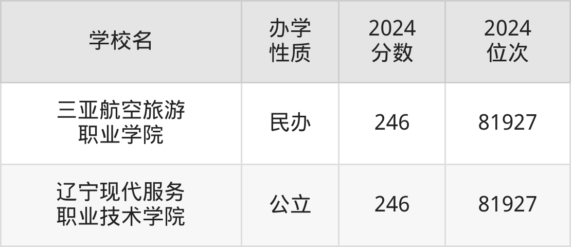| 辽宁现代服务 职业技术学院 | 246 | 81927 |