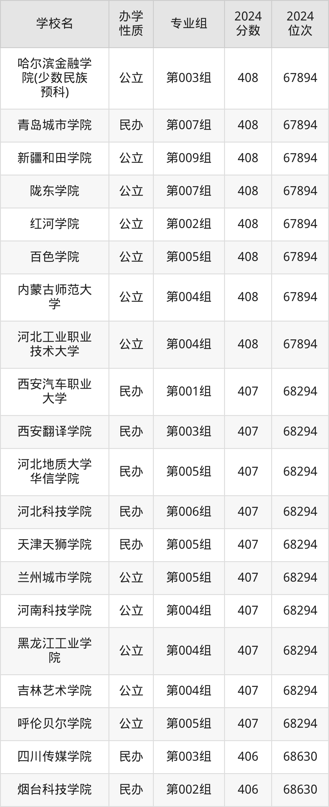 | 哈尔滨金融学 院(少数民族 预科) | 第003组 | 408 | 67894 |
