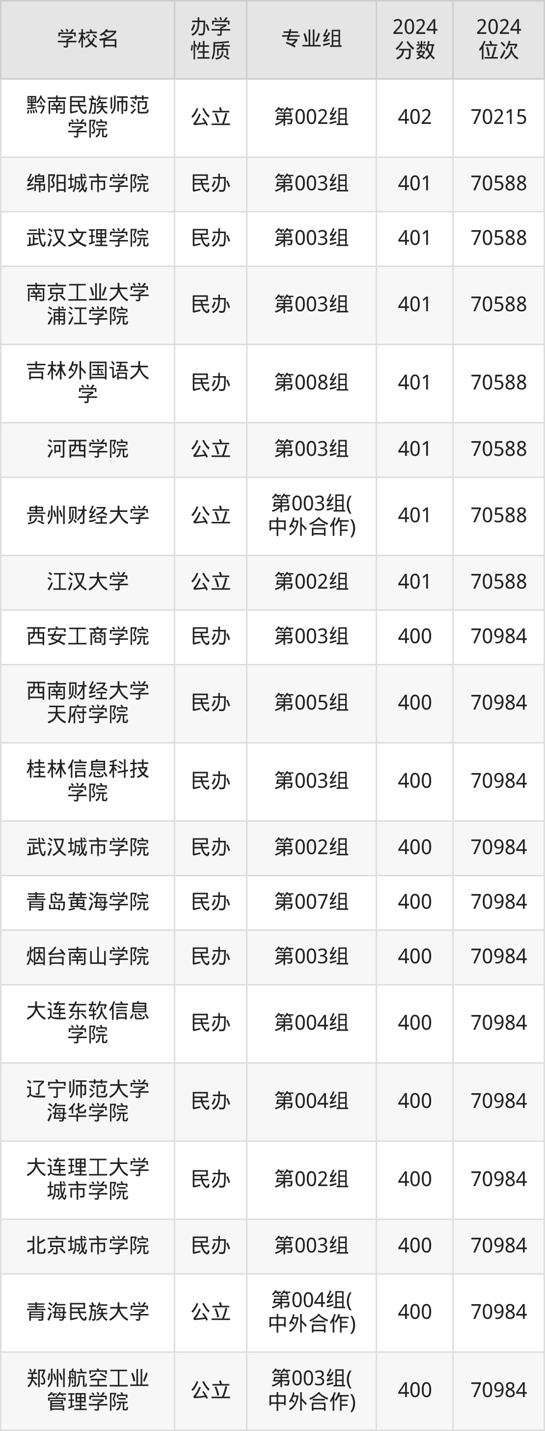 | 青海民族大学 | 第004组( 中外合作) | 400 | 70984 |