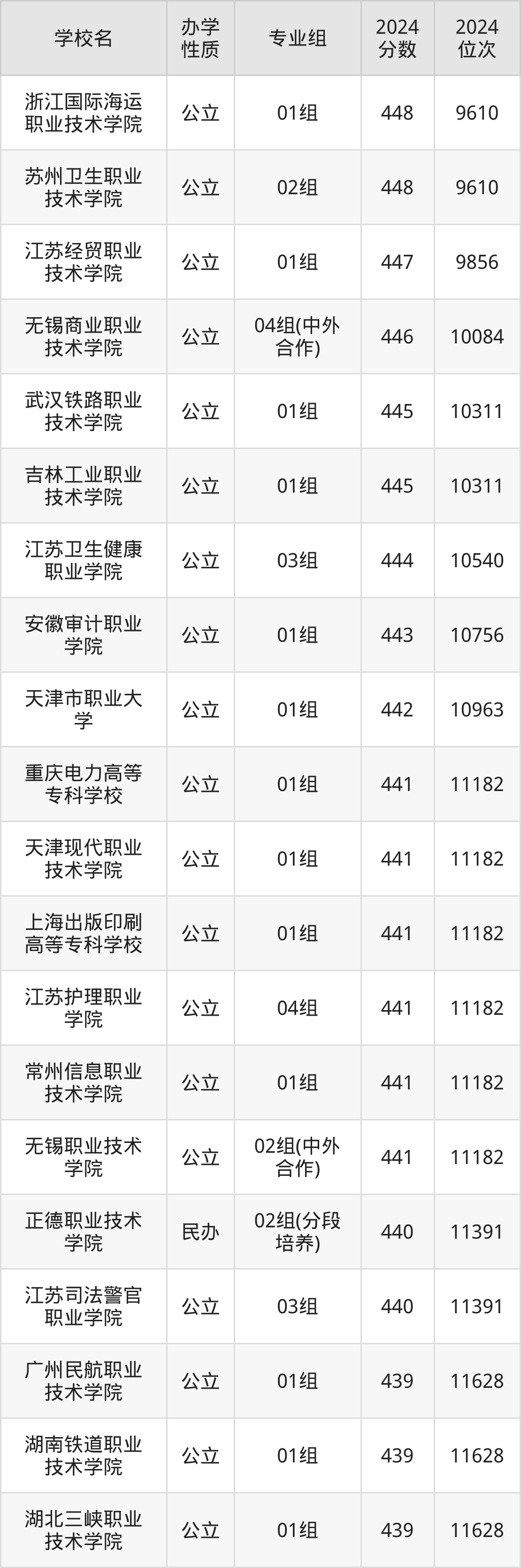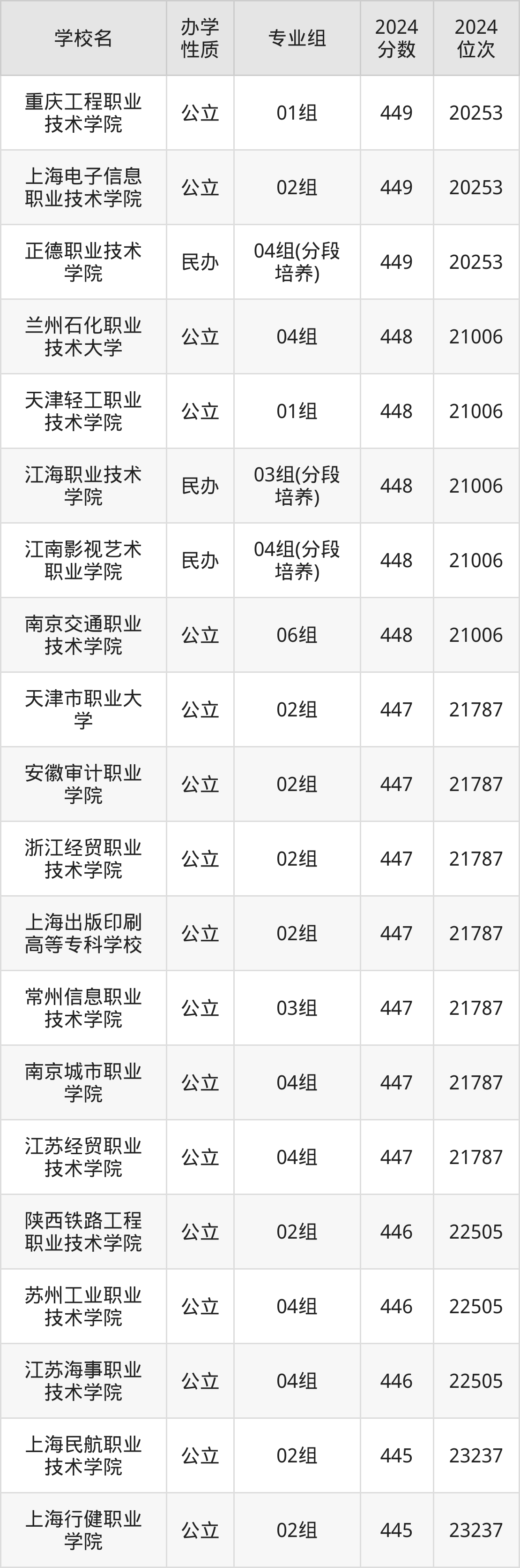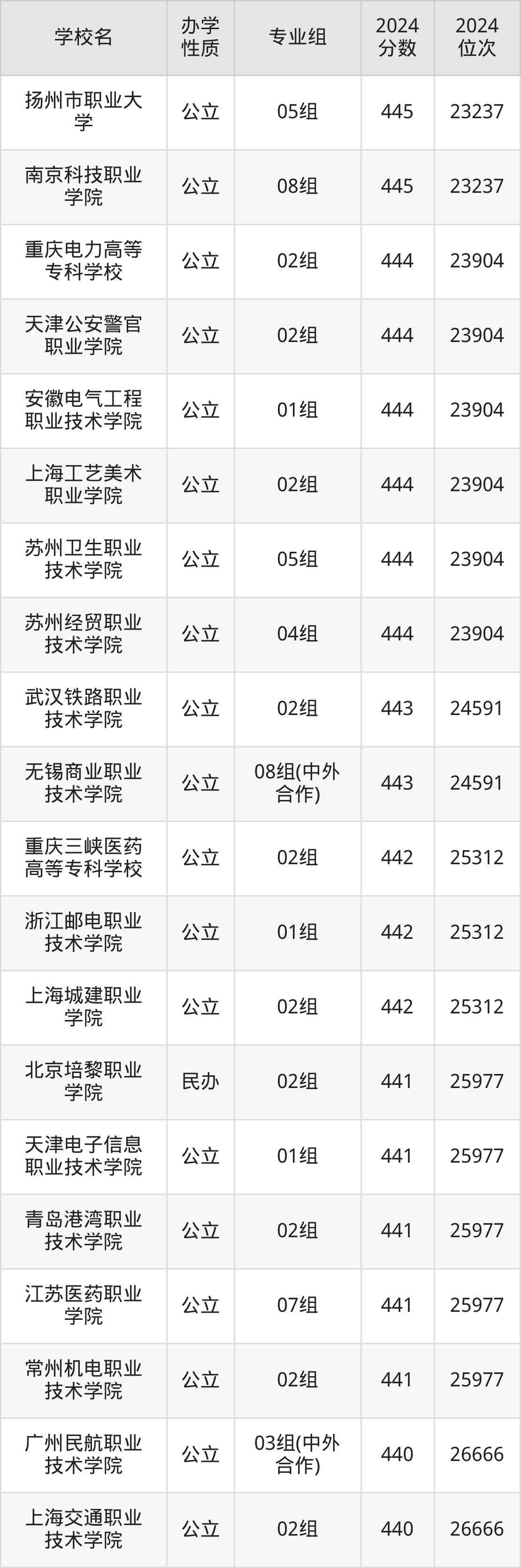 江苏444分左右的考生可以上重庆工程职业技术学院、上海电子信息职业技术学院、正德职业技术学院等院校,刚好在444分的院校有重庆电力高等专科学校、天津公安警官职业学院、安徽电气工程职业技术学院等。
